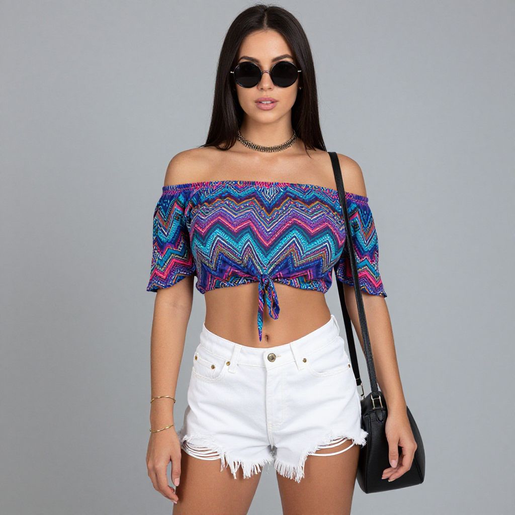 "Woman, bohemian, off-the-shoulder top with zigzag and diamond patterns in a mix of vibrant blue, pink, and purple hues, short flutter sleeves, midriff-baring, denim white cutoff shorts with frayed hems, round black sunglasses, metallic choker necklace, simple gold bangle, black shoulder bag with a rounded base and minimal. Sexy. Pretty face and beаutiful eyes. Big breasts."