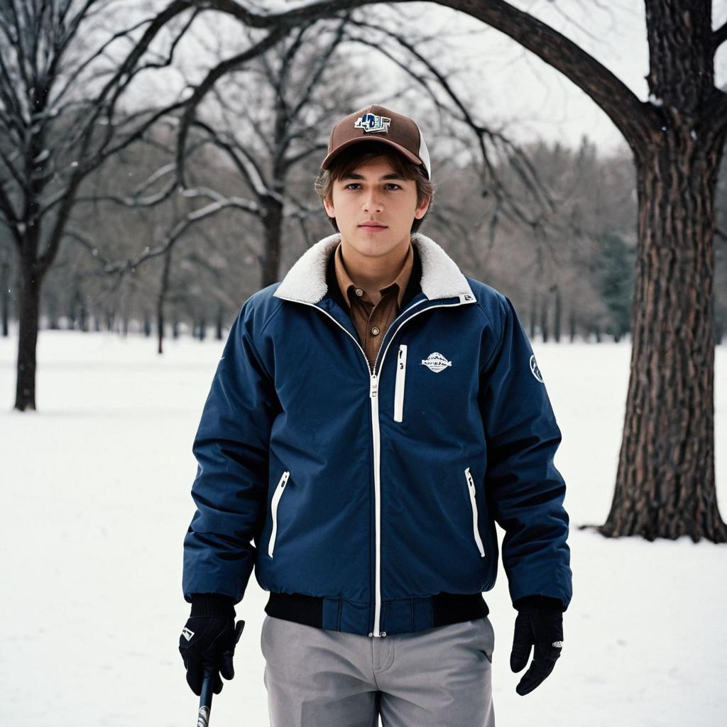 Portrait of a young man standing outdoors in a snowy park wearing a winter golf outfit. He has brown hair and is dressed in a blue insulated jacket with white zippers and a shearling collar, gray pants, black gloves, a brown collared shirt, and a brown and white baseball cap. Bare trees and snow-covered ground are visible in the background.
