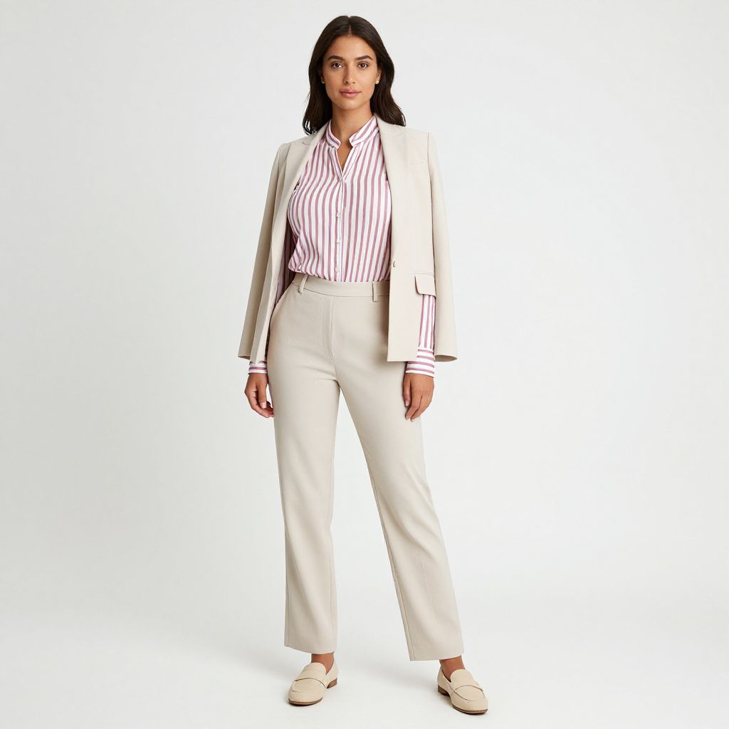 "Woman, business casual, lightweight beige blazer with notched lapels, matching straight-leg trousers, pink and white vertical striped blouse, collar, long sleeves with cuffs, beige slip-on loafers, plain white background.. Sexy. Pretty face and beаutiful eyes. Big breasts."