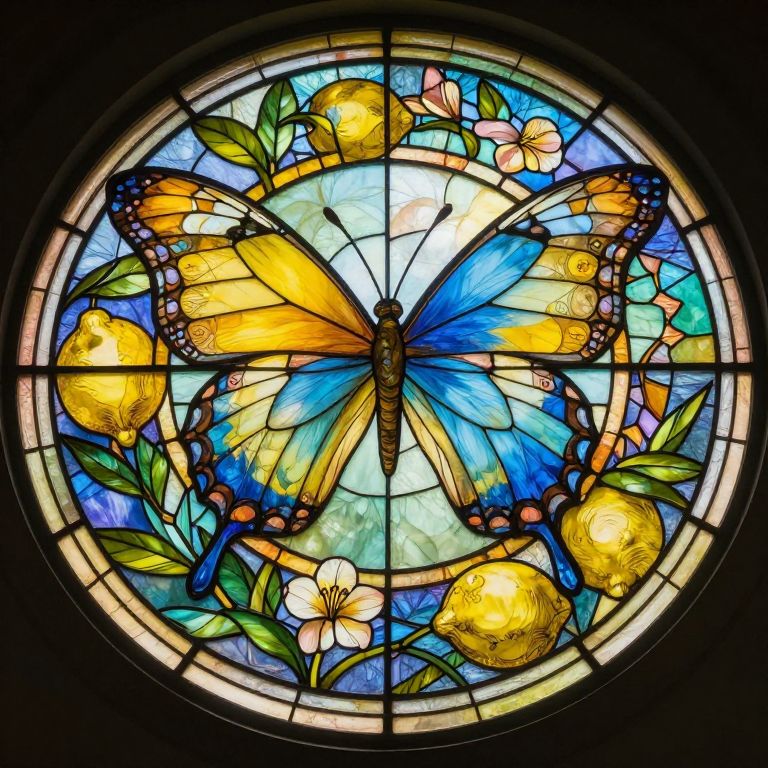 Vibrant stained glass circular window depicting a large blue and yellow butterfly surrounded by lemons, flowers, and green leaves.