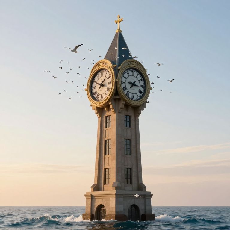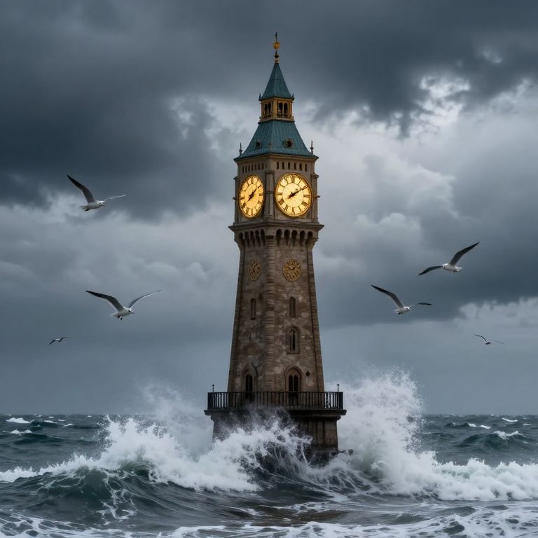 A majestic clock tower emerges defiantly from the turbulent ocean, its golden faces glowing against the stormy sky, while seagulls soar in a surreal dance between the waves and the heavens.