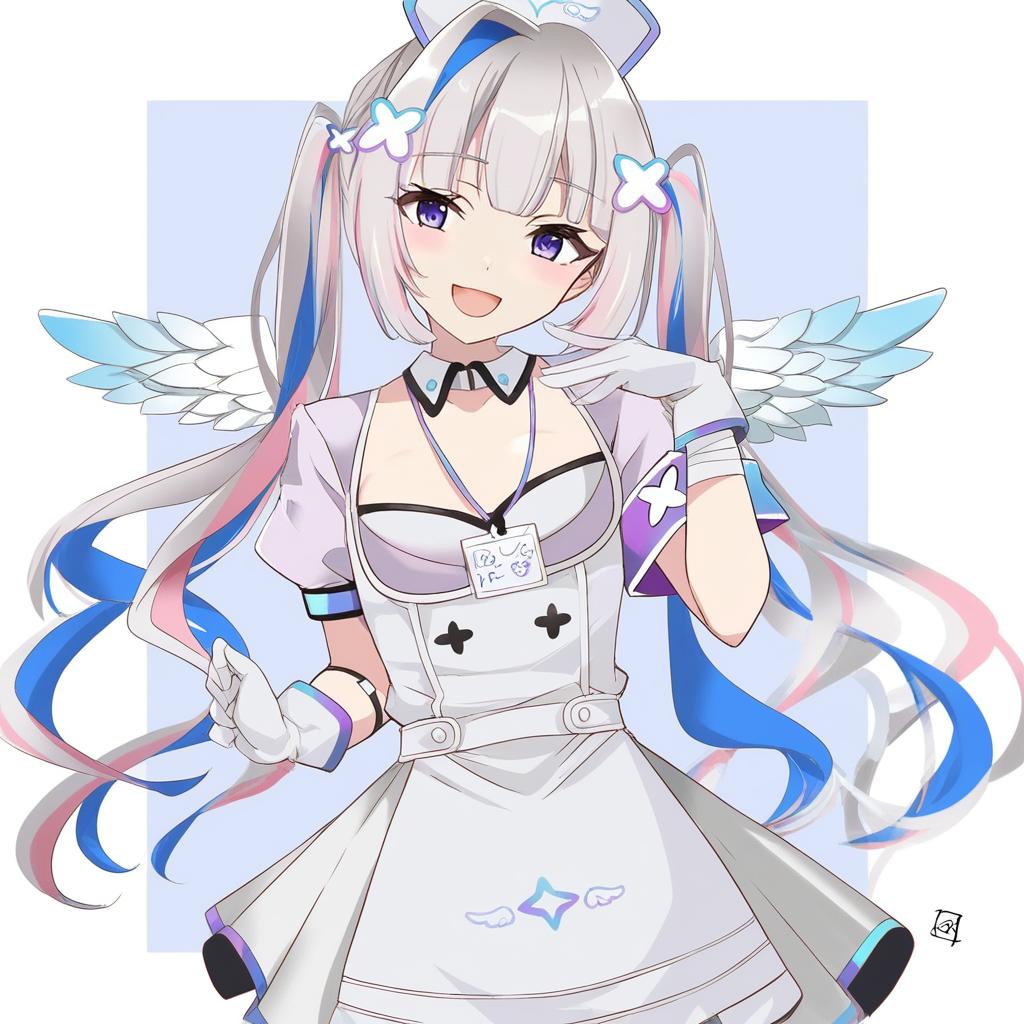 Amane kanata (nurse), hololive, 1girl, angel wings, angel wings, purple eyes, blue hair, grey hair, colored inner hair, single hair intake, official alternate hairstyle, streaked hair, official alternate hair length, long hair, pink hair, x hair ornament, twintails, blunt bangs, small breasts, flat chest, nurse cap, white gloves, white dress, white apron, detached collar, puffy short sleeves, virtual youtuber, virtual youtuber, feathered wings, feathered wings, nurse, nurse, bandaged arm, id card, armband, by artist aoi manabu, leet