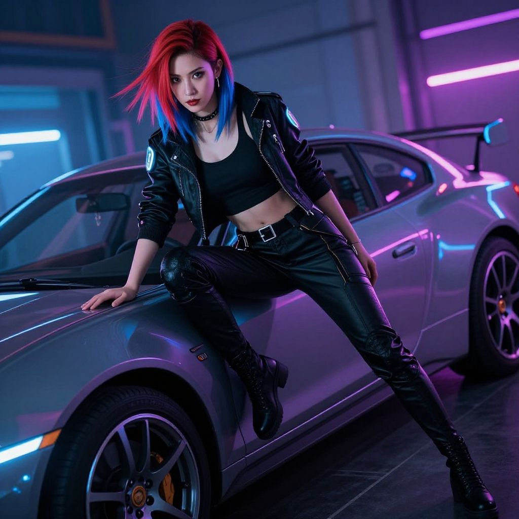 Photograph of a young woman with striking red and blue dyed hair, sitting confidently on a sleek, silver car in a neon-lit urban setting. She wears a black leather jacket, crop top, and tight leather pants with black boots. Her piercing gaze is directed at the camera. The car has glowing purple and blue lights, and the background features illuminated windows and doors, adding a futuristic vibe. Her posture is relaxed yet assertive, with one hand on the car and the other on her thigh. The image has a dramatic, cyberpunk aesthetic.