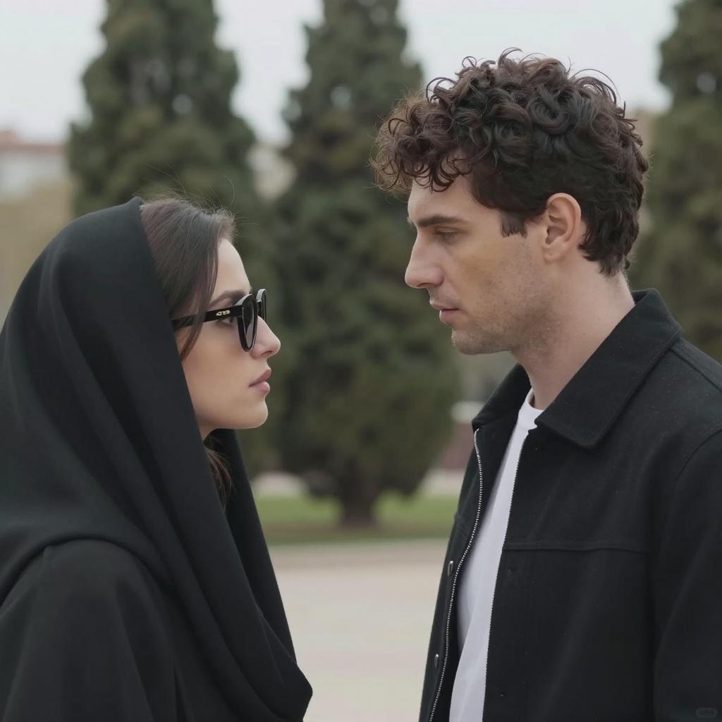 A man and woman in a restaurant. The man with dark hair, dressed in a gray suit and white shirt, leans forward with a concerned expression. The woman, with dark hair in an updo, wears a black dress and pearl earrings, holds a cigarette to her mouth, looking at the man. A detailed mural with historical figures is in the background. The woman's right hand rests on a green counter. The man's left ear is partially visible. Two people, intense facial expressions, detailed background.