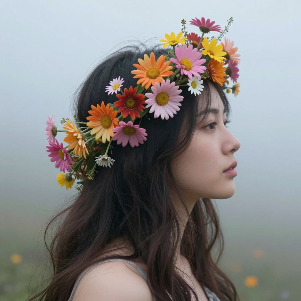 A woman's profile emerges ethereally against a misty backdrop, her dark hair adorned with a vibrant crown of colorful wildflowers, including daisies in shades of pink, orange, and yellow, creating a dreamlike fusion of nature and artistry.