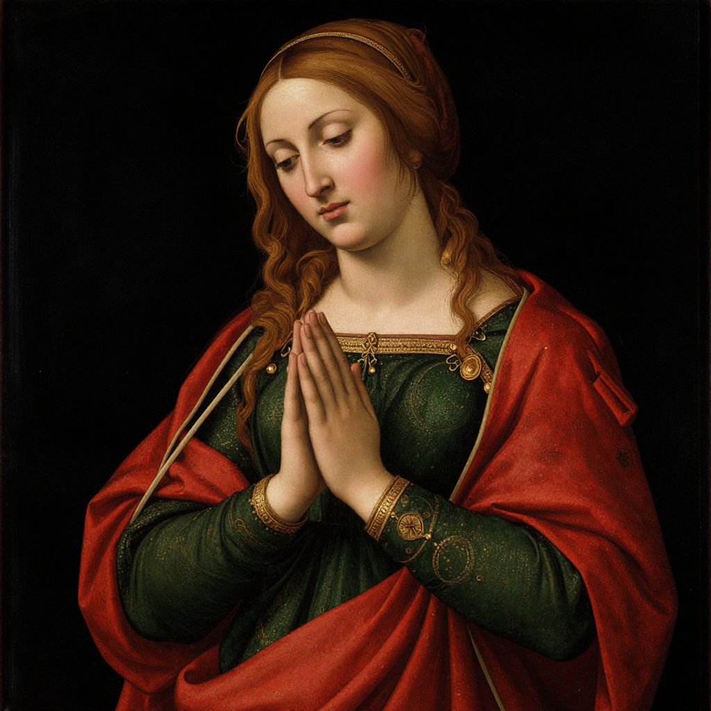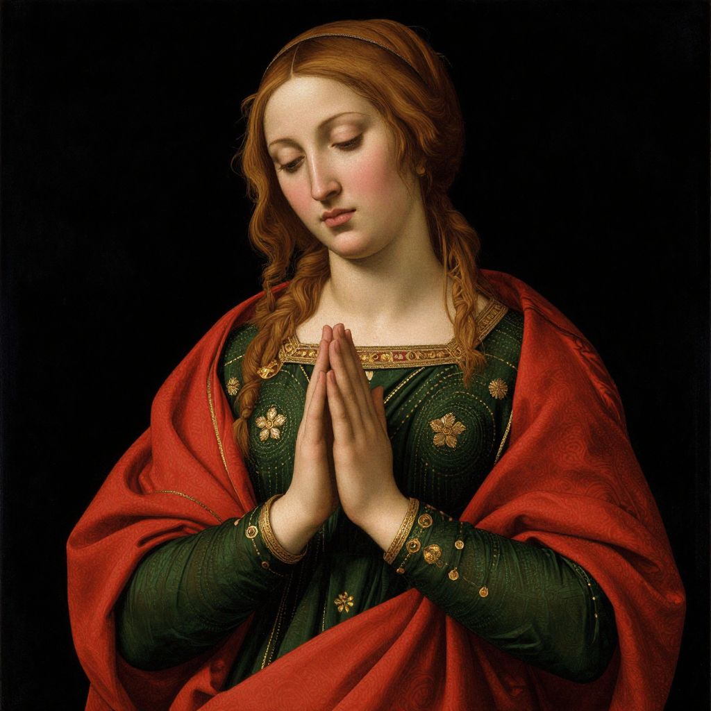 This is a digital rendering of a Renaissance-style religious painting depicting a young woman with fair skin and long, wavy auburn hair. She wears a dark green, intricately patterned dress with gold trim and a red cloak draped over her shoulders. Her hands are pressed together in a prayer position at her chest. She has a serene expression with soft, pink blush on her cheeks. The background is solid black, emphasizing her figure. The texture of the dress and cloak is detailed, with visible folds and a slight sheen. Her hair is partially covered by a thin, gold headband.