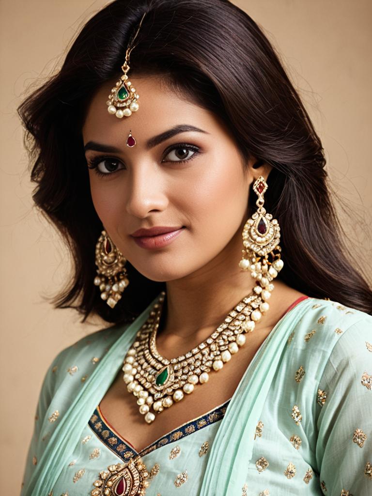 Woman in Dhoti Suit Salwar, close-up detailed headshot with jewelry --sref 1390