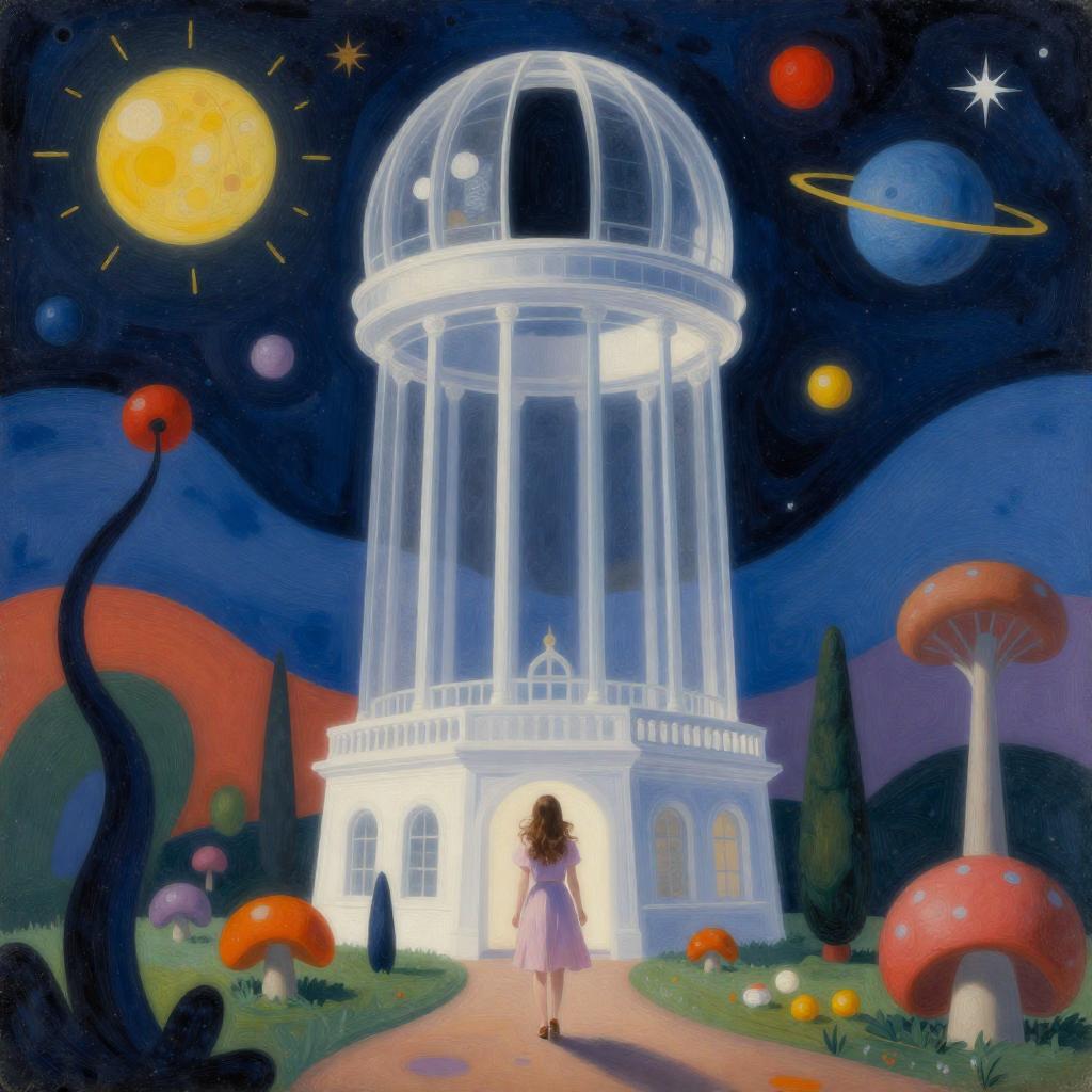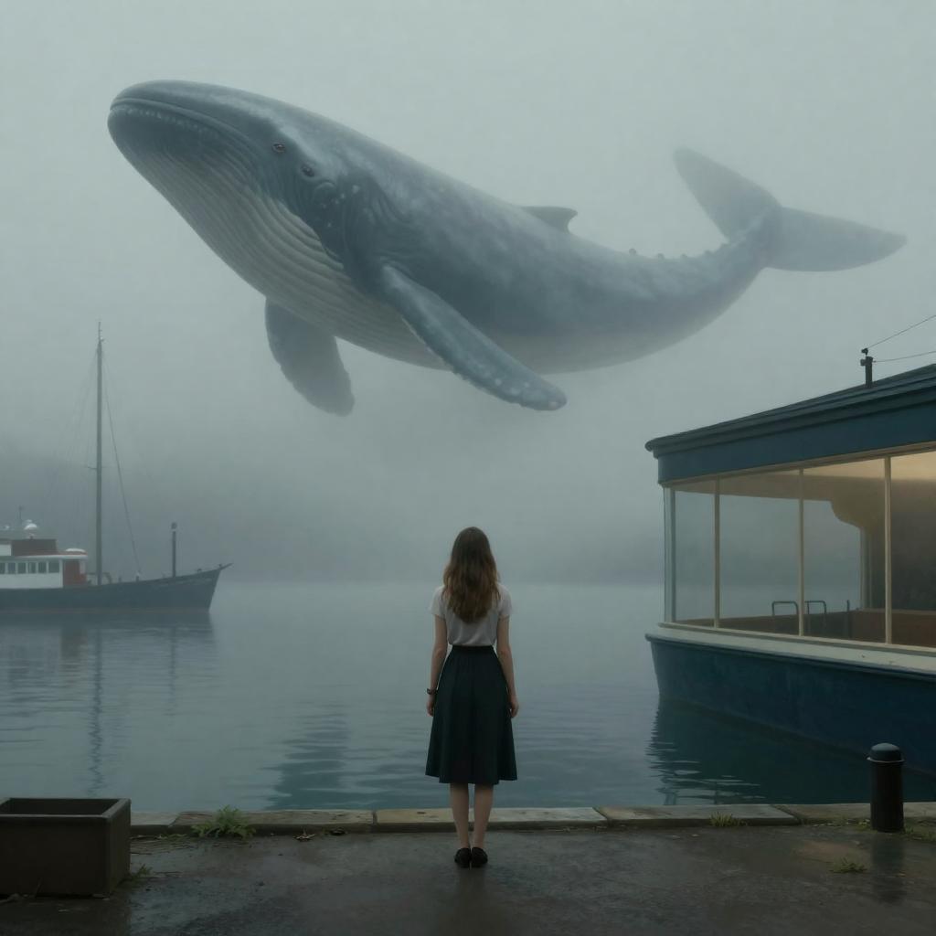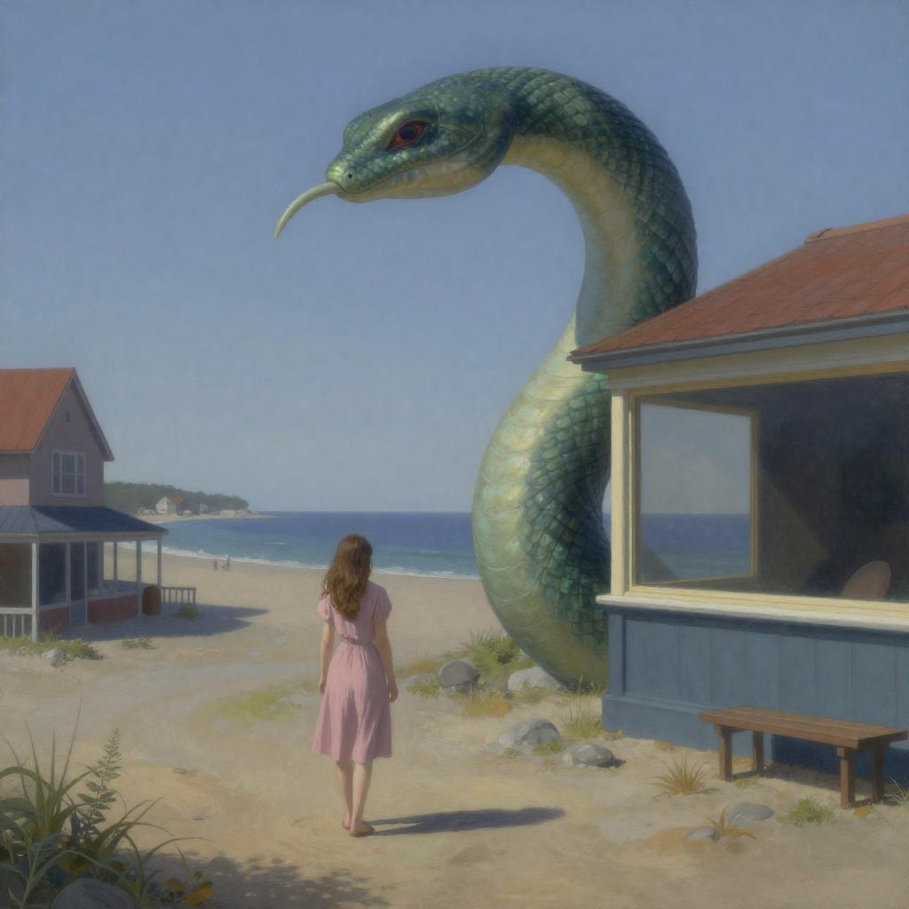Imagine a breathtaking visual that merges the styles of Edward Hopper and Georgia O'Keeffe, set in an enchanting deserted seaside town. A towering, whimsical sea serpent ascends from the depths, symbolizing dreams invading everyday life. A gorgeous girl navigates this bizarre realm, embarking on a journey through the intricate layers of consciousness, beautifully encapsulated in a masterful composition.