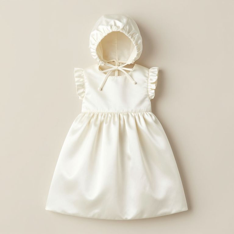 Photograph of a white, satin, child-sized dress displayed on a headless, armless mannequin. The dress has a round, ruffled hood, short puffed sleeves, and a gathered waist. The fabric has a smooth, glossy texture, reflecting light and creating subtle shadows on the white background. The dress is centered in the image, with the mannequin's head and arms removed, focusing attention on the garment's design and texture. The overall style is simple and elegant, suitable for formal or special occasions.