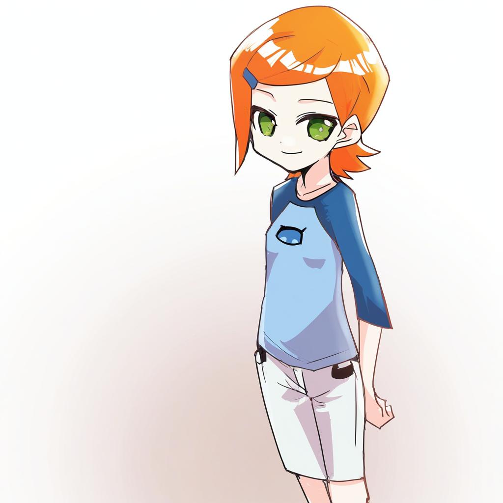 Gwen tennyson, ben 10, 1girl, green eyes, orange hair, short hair, hairclip, small breasts, by artist j7w, leet