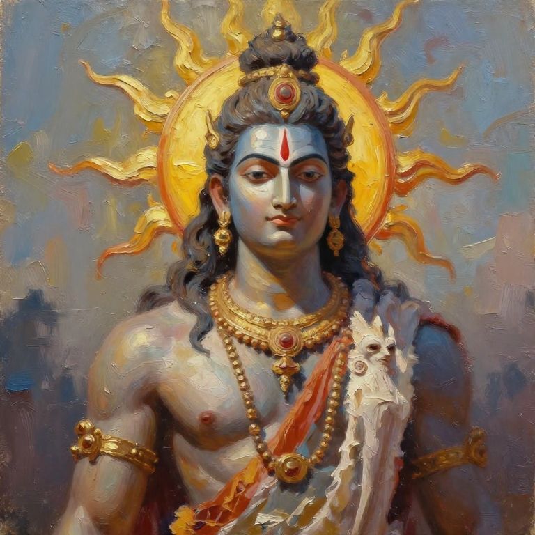 Fleece Surya, Hindu God of Sun, ultra realistic, unreal engine, cinematic lighting, oil painting, thick pallet knife strokes, Alex Ross style,