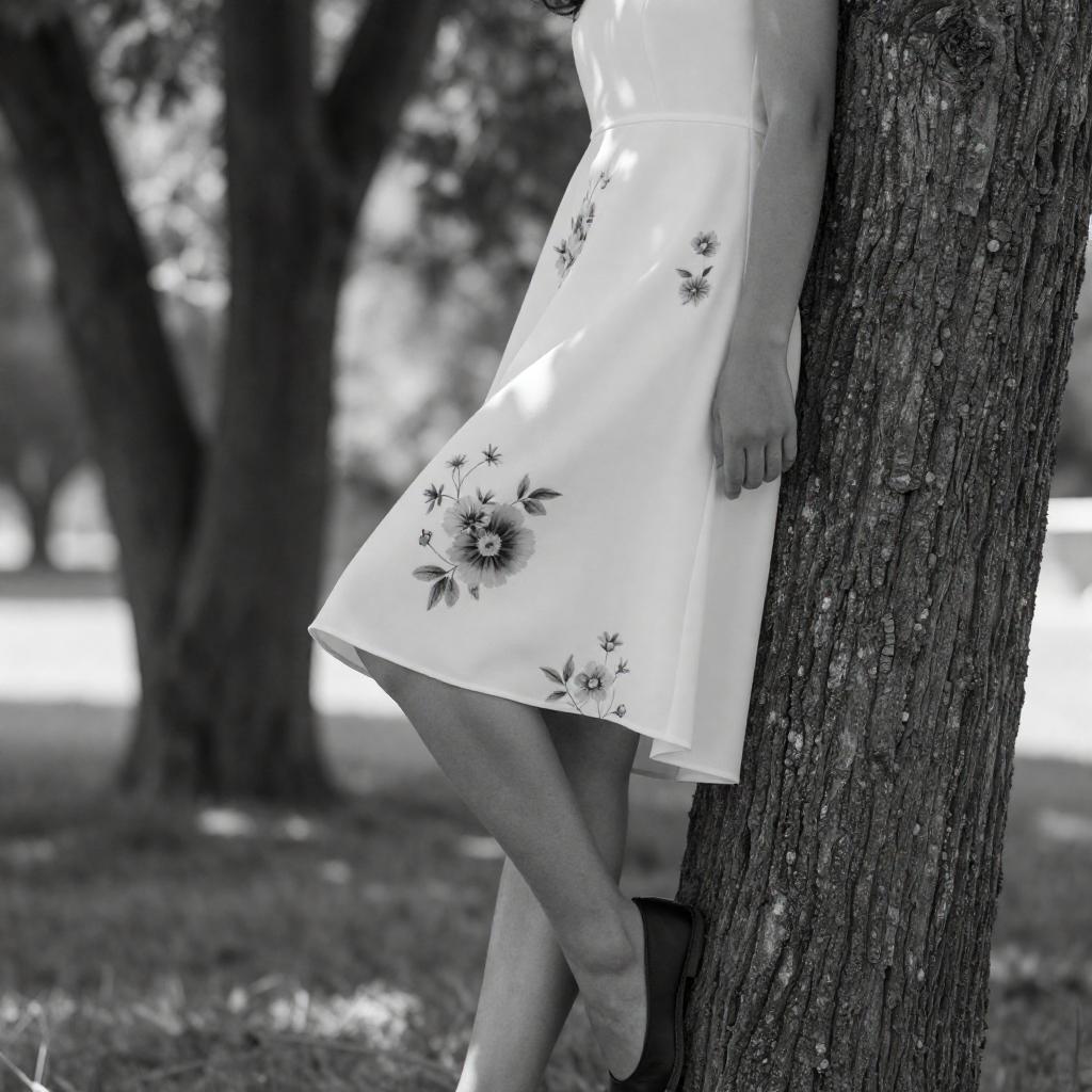 Black-and-white photograph of a woman leaning against a tree. She wears a white, floral-patterned dress and black shoes, with her legs crossed at the ankles. The tree's rough bark contrasts with her smooth dress fabric. Sunlight filters through the background foliage, creating a dappled light effect.