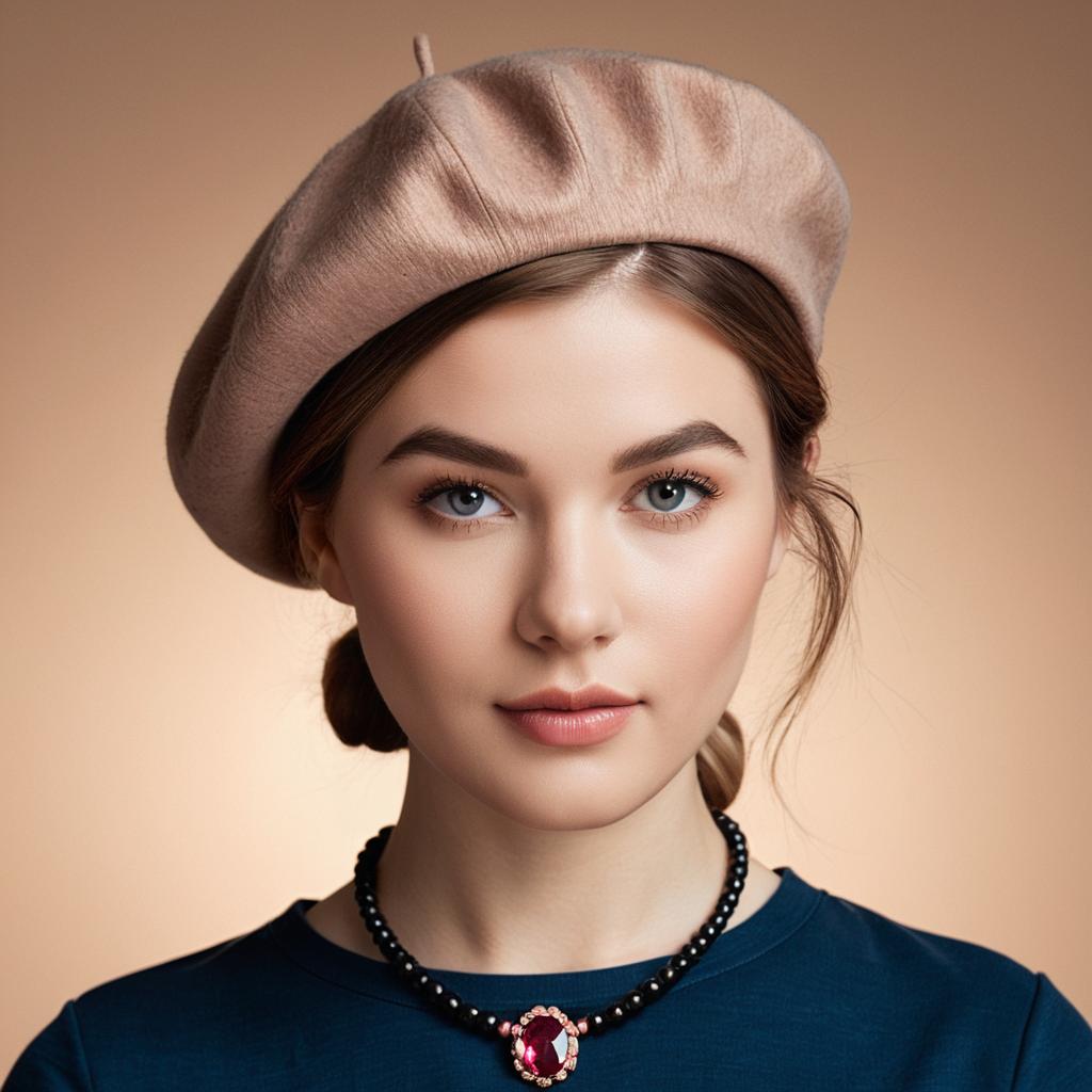 Photorealistic portrait of a young woman dressed in 1920s fashion. She wears a brown short-sleeve dress with ruffled sleeves, a matching brown belt, and a brown beret. Her bob haircut complements the vintage look. She accessorizes with layered gold necklaces featuring turquoise beads. The setting is an outdoor area with blurred architectural elements in the background. The lighting is soft, enhancing the warm color palette and elegant, poised appearance of the subject, who has subtle makeup and a slightly serious expression.