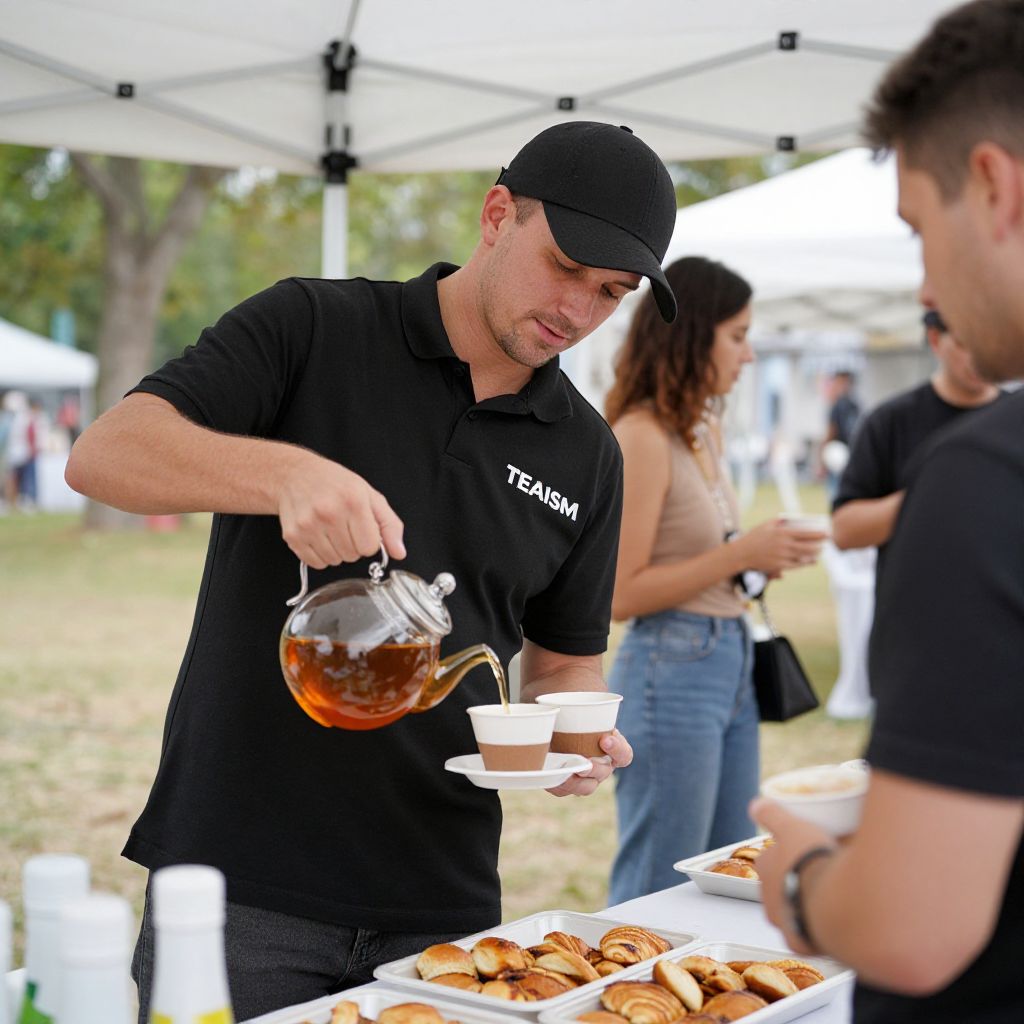 Man in a black \"TEAISM\" polo shirt and cap pours hot tea into cups while serving refreshments at an outdoor event under a white canopy, surrounded by guests and trays of baked goods.