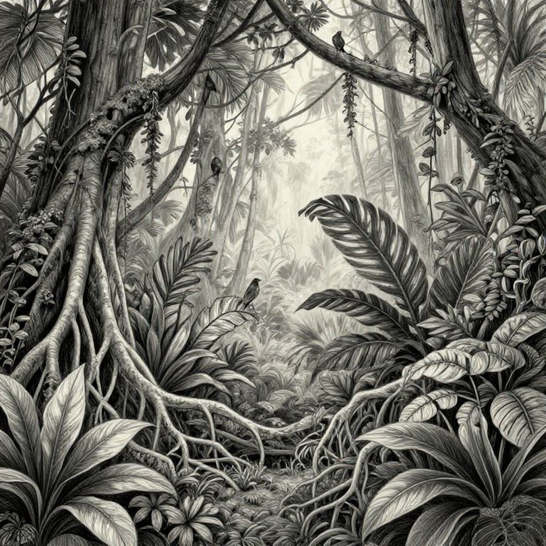 Jungle drawing background illustrating a lush rainforest scene with intricate linework showing twisting roots, broad-leafed plants, creeping moss, small birds perched on branches, and a misty atmosphere that evokes depth and mystery, rendered in textured pencil strokes.