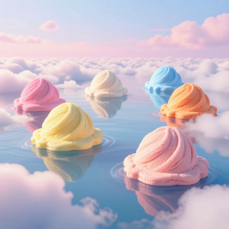 Floating ice cream mountains, each peak a vibrant hue of pastel colors—pink, yellow, blue, and orange—drift serenely above a tranquil sea of soft, billowing clouds, creating a whimsical archipelago in a dreamlike sky.