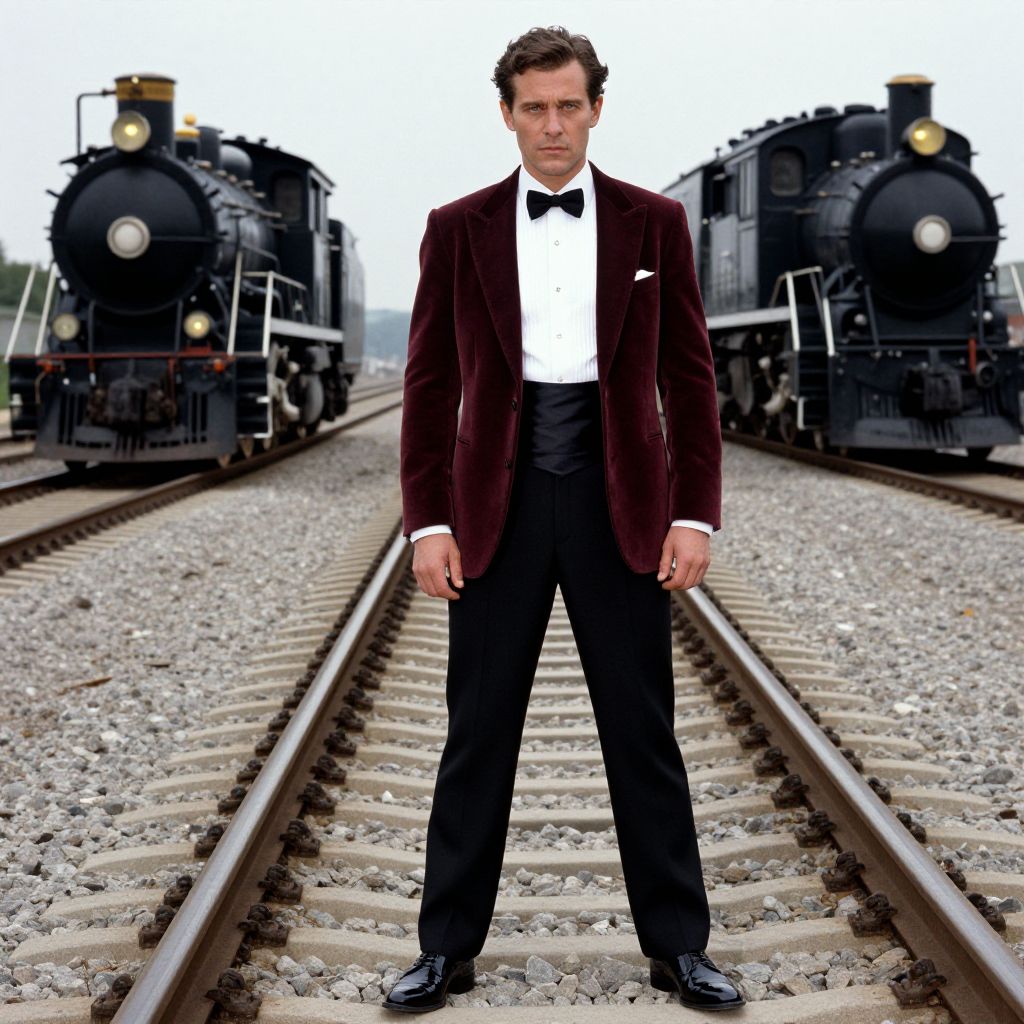 A man, rich burgundy velvet tuxedo jacket, white cotton dress shirt with pleats, black satin waistcoat, fitted black trousers, shiny black dress shoes, vintage locomotives, polished brass fittings, expansive railway tracks, 3M analog film stock, confident expression Man has masculine face and piercing eyes