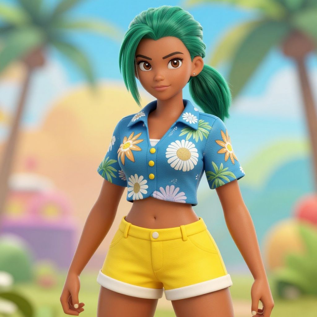 Semi realistic 3d fully body illustration of ((1girl:1.4)), ((solo:1.4)), Costume_DC_YJ_Megan_ownwaifu, 1girl, colored skin, green skin, long hair, makeup, lipstick, lips, red hair, freckles, brown eyes, bangs, red lips, mole under eye, yellow sclera, alien, eyeshadow, cape, gloves, superhero, skirt, blue gloves, bodysuit, multicolored clothes, navel, belt, blue cape, elbow gloves, covered navel, blue legwear, thin eyebrows, large breasts, cowboy shot, standing, (insanely detailed, masterpiece, best quality), depth of field, center, facing viewer, detailed landscape