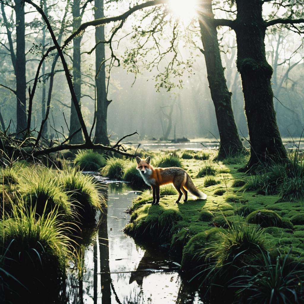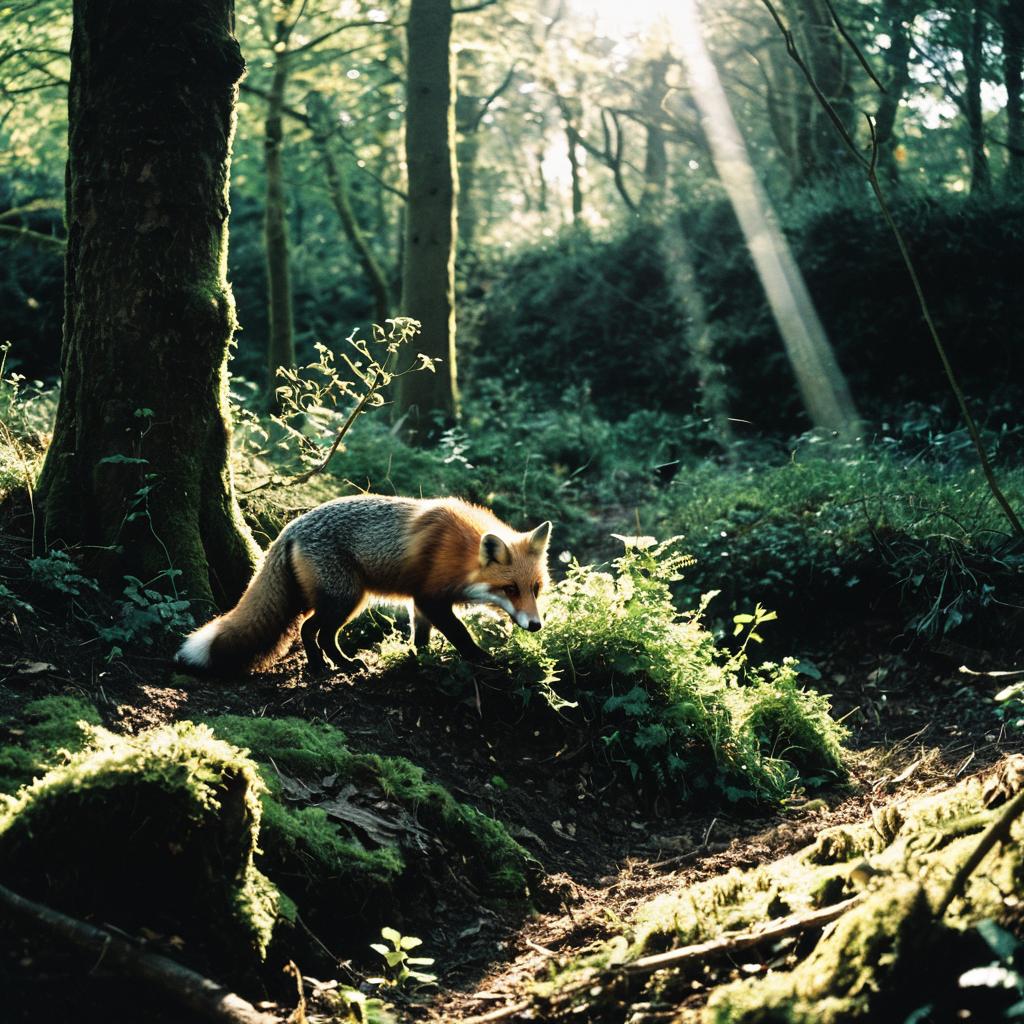 No humans, nature, animal, signature, realistic, outdoors, tree, forest, thick undergrowth, bluebell, fox, animal focus, dog, sunlight, fallen leaf, damp moss, scenery, light rays, day