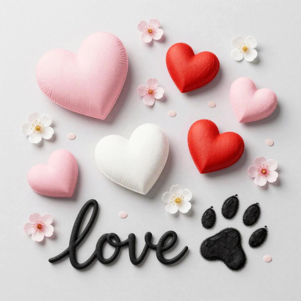 A romantic scene with soft textured hearts in pastel pink, white, and red colors, scattered delicate white and pink flowers, a textured black paw print, and the word 'love' in black script, all arranged on a light gray background with subtle small rounded accent shapes