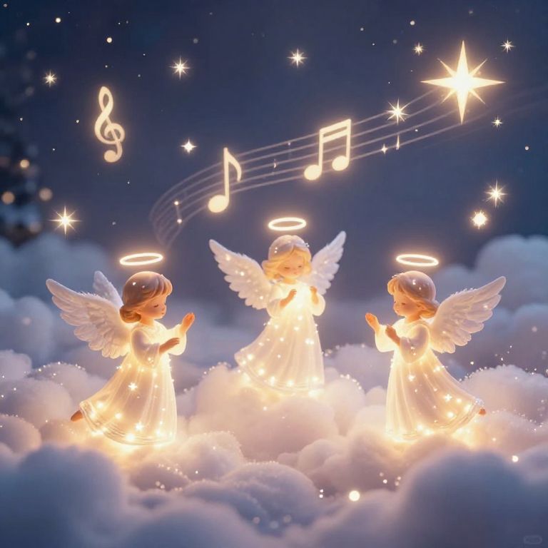 Photograph of three glowing angel figurines with halos, white wings, and golden robes, standing on a bed of soft white clouds against a dark blue, starry night sky. The angels, positioned in a triangular formation, are illuminated from within, creating a warm, ethereal light. Musical notes, including a treble clef and eighth notes, float above them, with a star shining brightly among the notes. The overall scene evokes a serene, heavenly atmosphere, blending light and darkness in a magical, celestial setting.