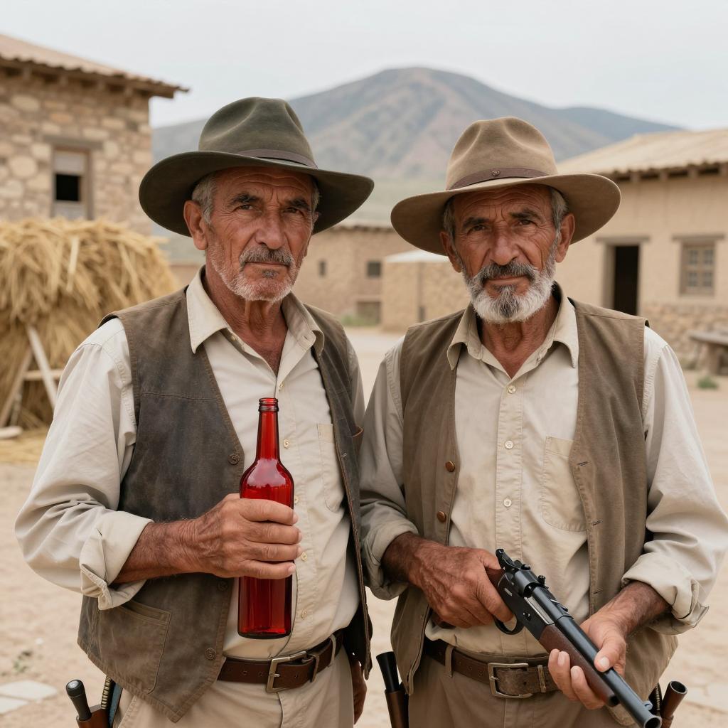 Portrait of a rugged bearded man with a serious expression wearing a brown wide-brimmed hat and a dusty olive-green shirt over a white-collared inner shirt. He holds a weathered wooden beam diagonally across his chest. The background features a dry, hilly landscape under a clear blue sky.
