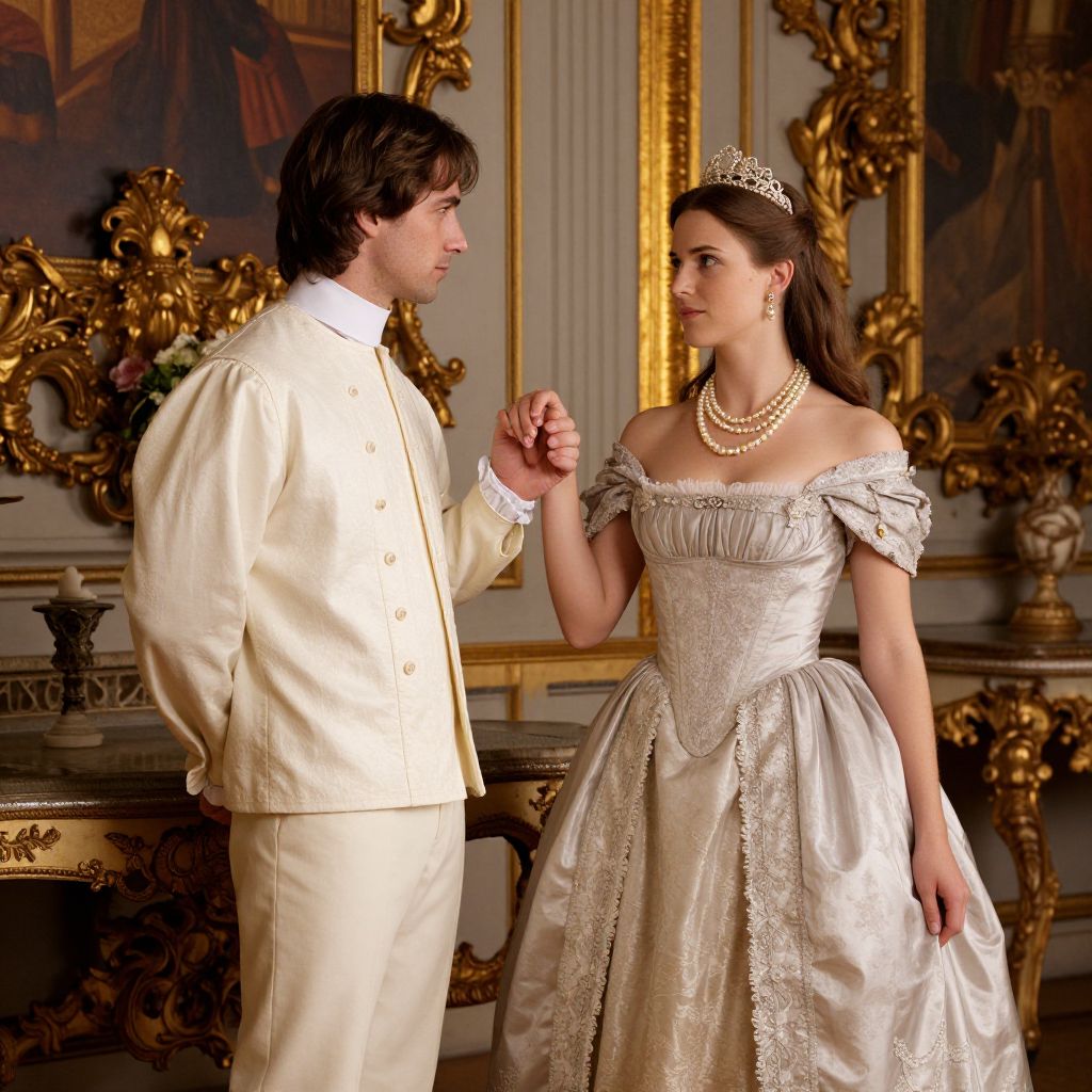 Elegant courtship scene depicts a man in a cream-colored doublet with a ruffled collar gently holding the hand of a woman adorned in a delicate off-the-shoulder gown, featuring a pearl necklace and a tiara, set against a richly decorated interior with ornate furniture and golden accents.