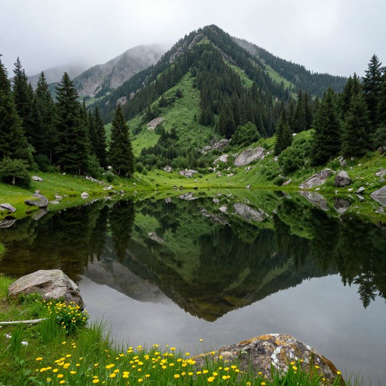 Calm reflections of towering, forested mountains mirror perfectly in Wedge Pond, surrounded by vibrant green grass, scattered rocks, and blooming yellow wildflowers under a misty sky.