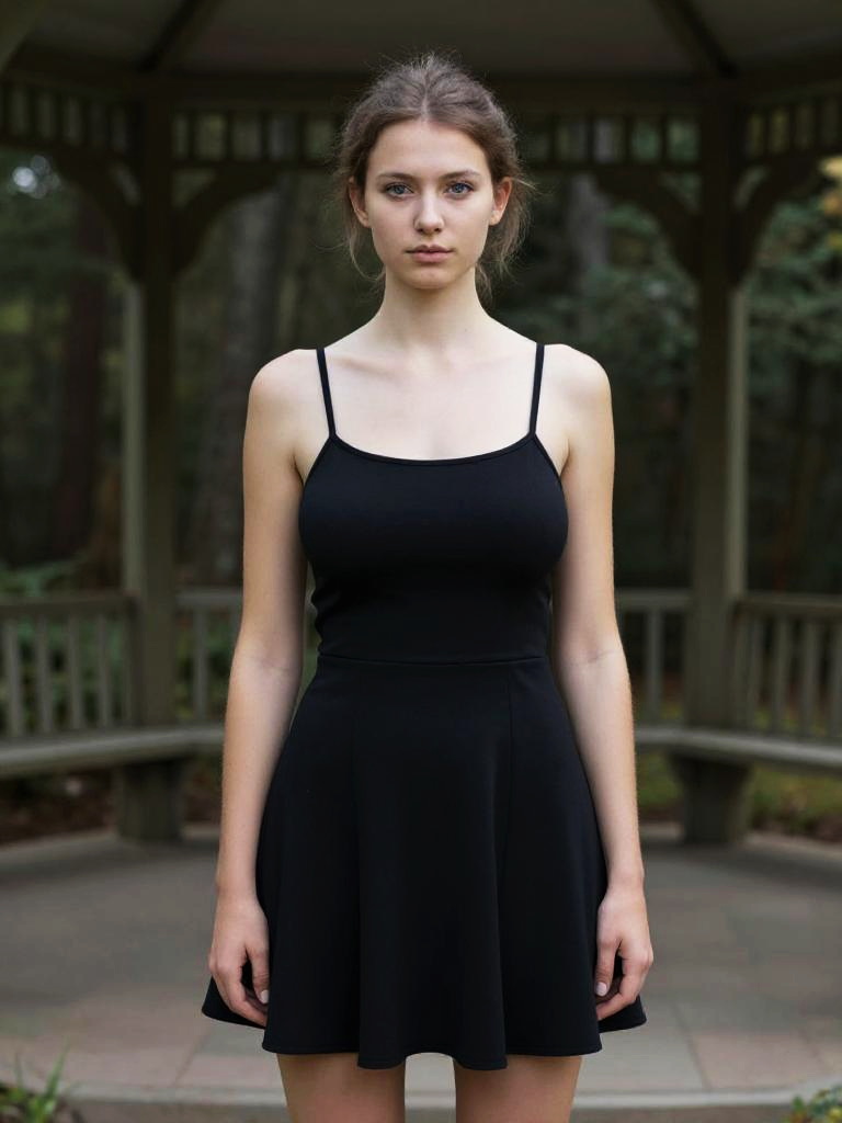 Photograph of a young woman with long blonde hair, black choker, sleeveless black mini dress, black tights, and white sneakers, standing