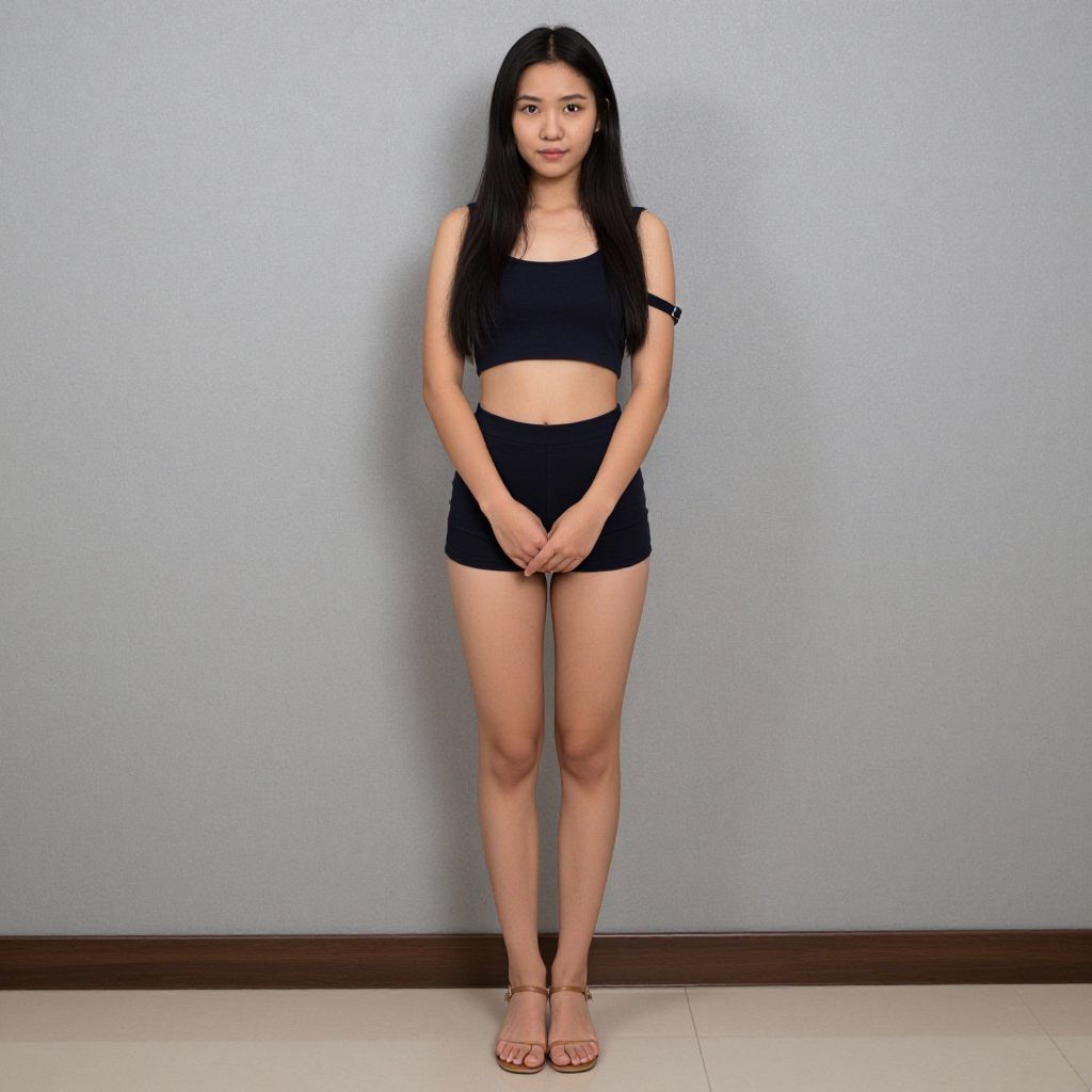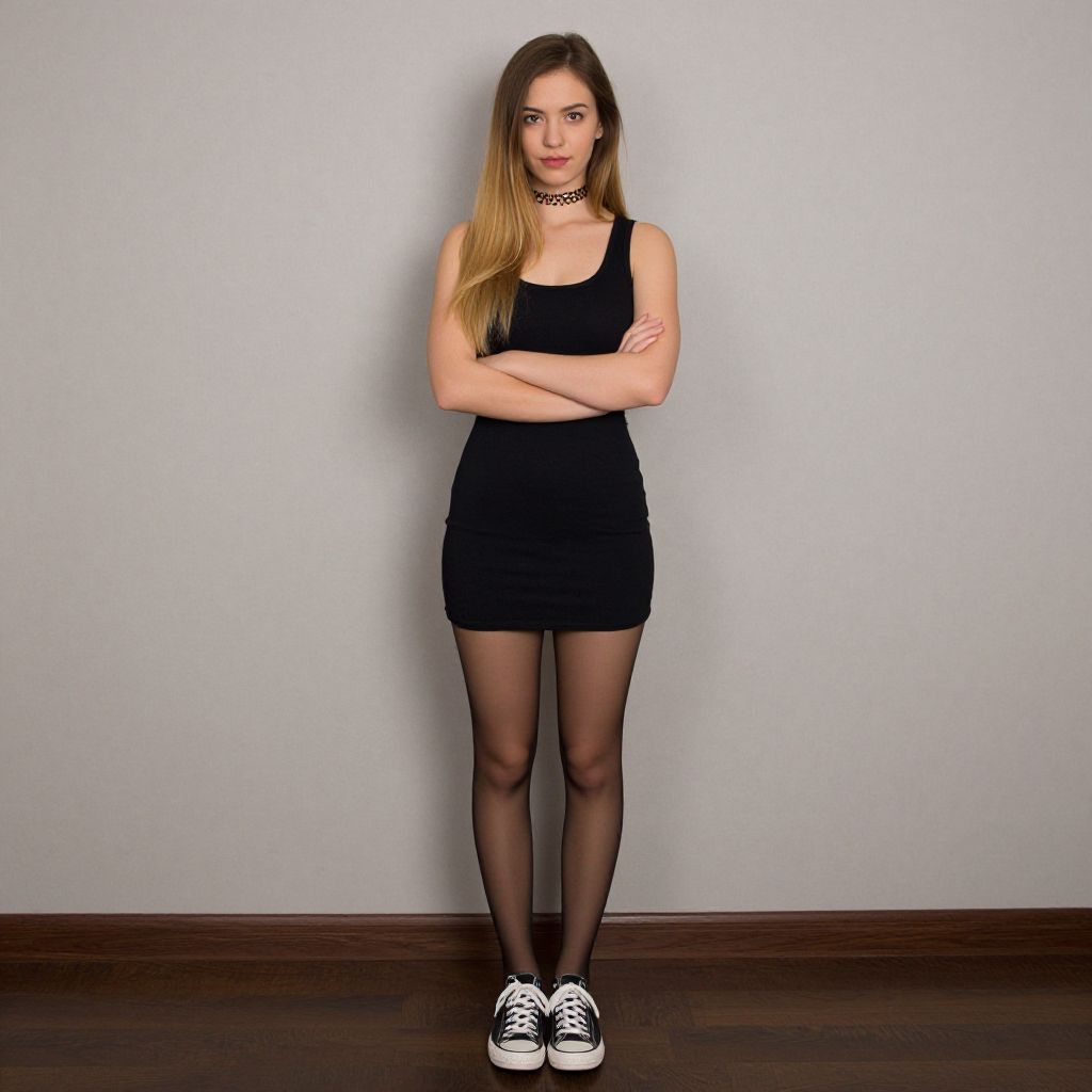 Photograph of a young Caucasian woman with long, straight, light brown hair standing against a plain, light gray wall. She wears a form-fitting, sleeveless black mini dress, black sheer tights, and white high-top sneakers with black laces. Her arms are crossed over her chest, and she has a neutral expression on her face. She wears a black choker necklace. The floor is dark wood. The image has a simple, minimalist style with soft lighting.