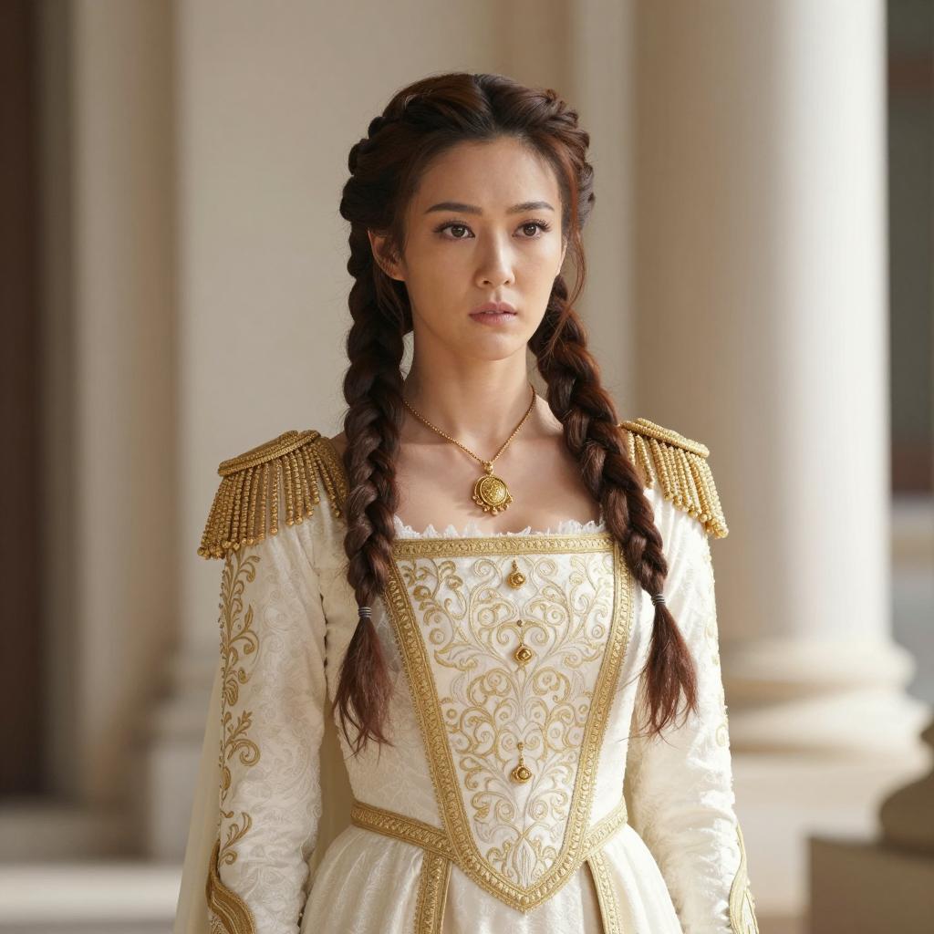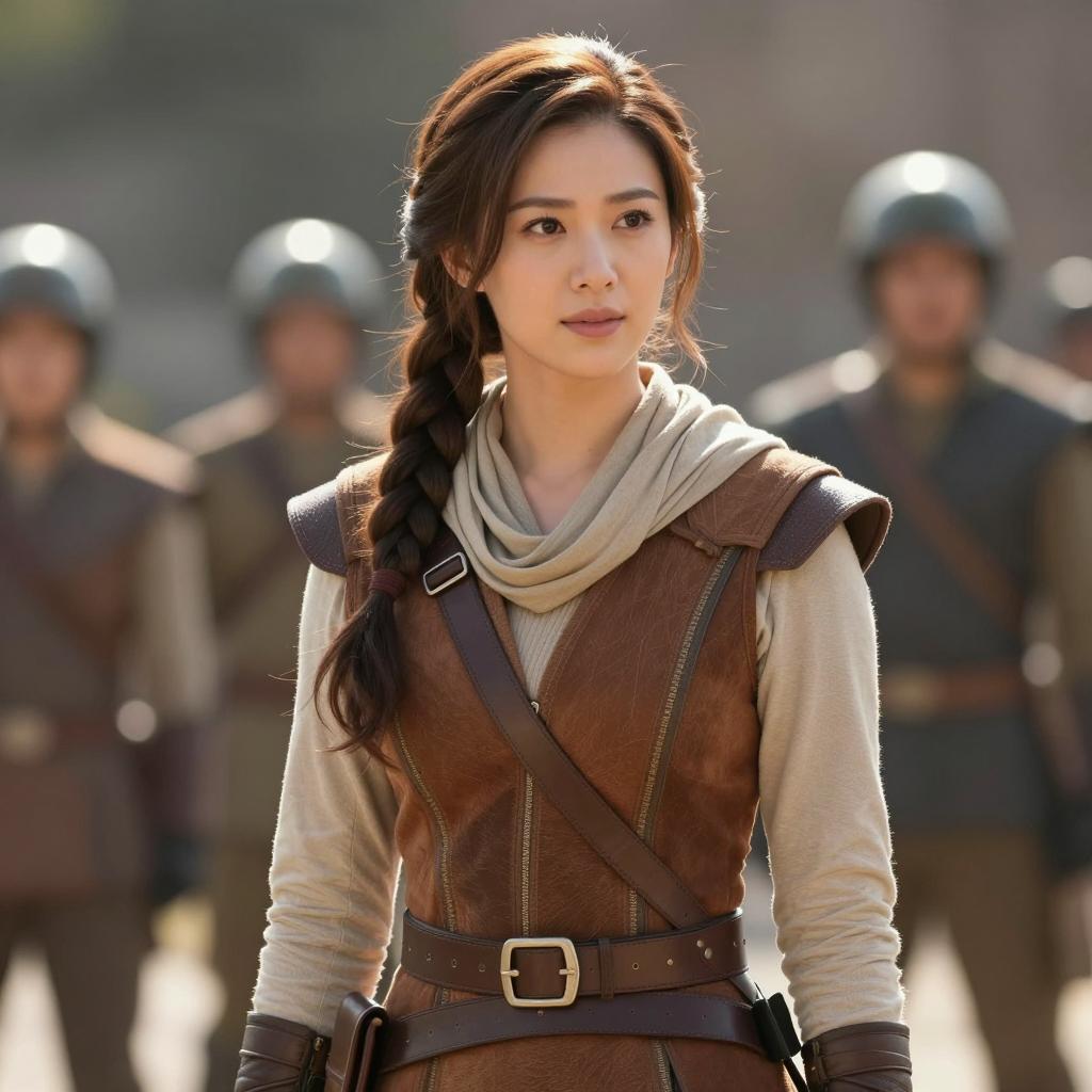Padme costume, photo of a woman with long brown hair in a braid, wearing a brown and beige layered outfit with a scarf, brown belt, and strap, outdoors, sunlight, blurred background with people in helmets, realistic style, strong facial features, confident expression, nature background, warm colors, medium shot