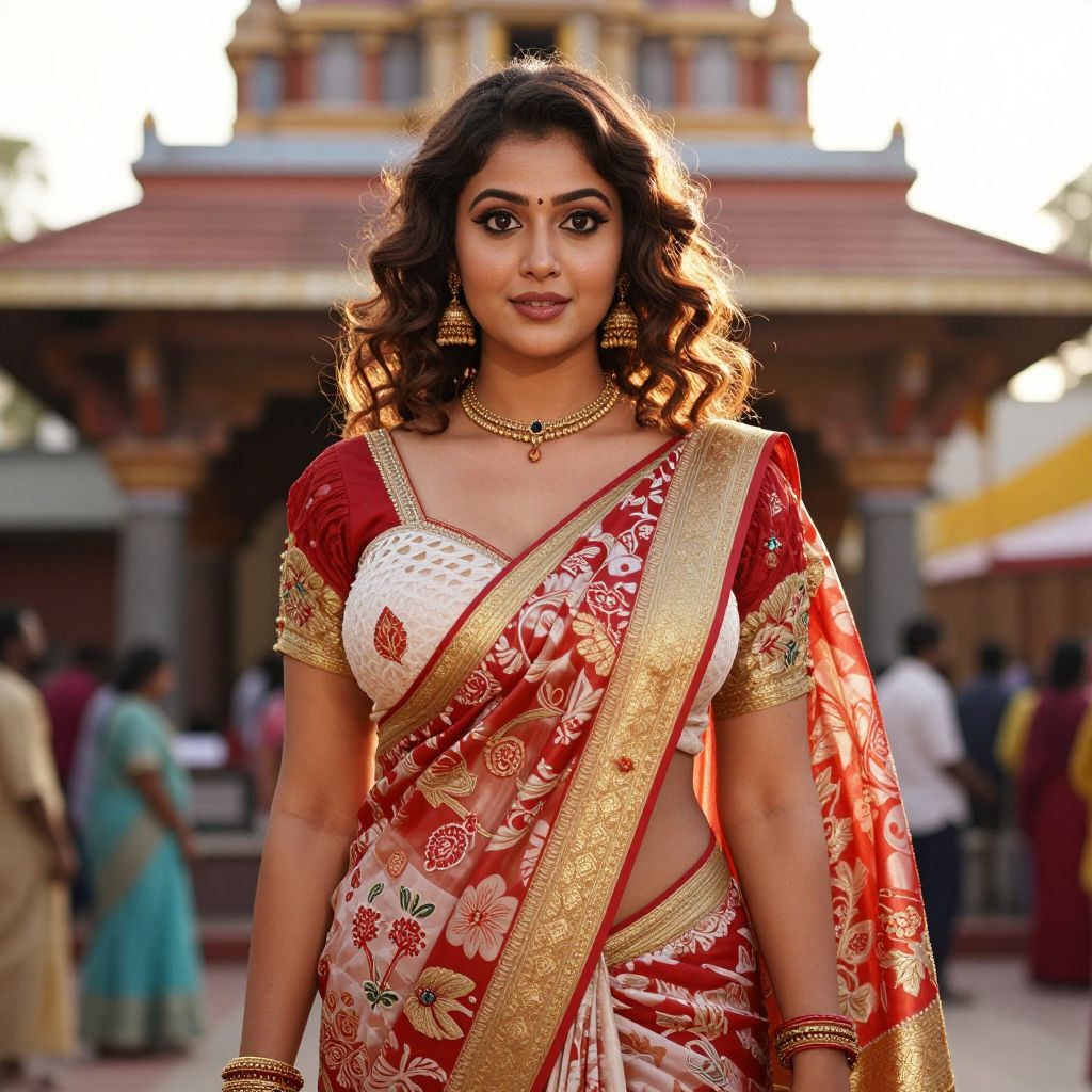 A vibrant, beautiful woman with olive skin, large expressive eyes, and curly brown hair wearing a richly patterned silk saree collection in crimson and ivory with golden borders, standing in front of a traditional temple mandapa during a cultural festival, the golden hour sunlight highlighting the delicate texture of the fabric and vibrant details of the embroidery.. The woman has big tits and cute face