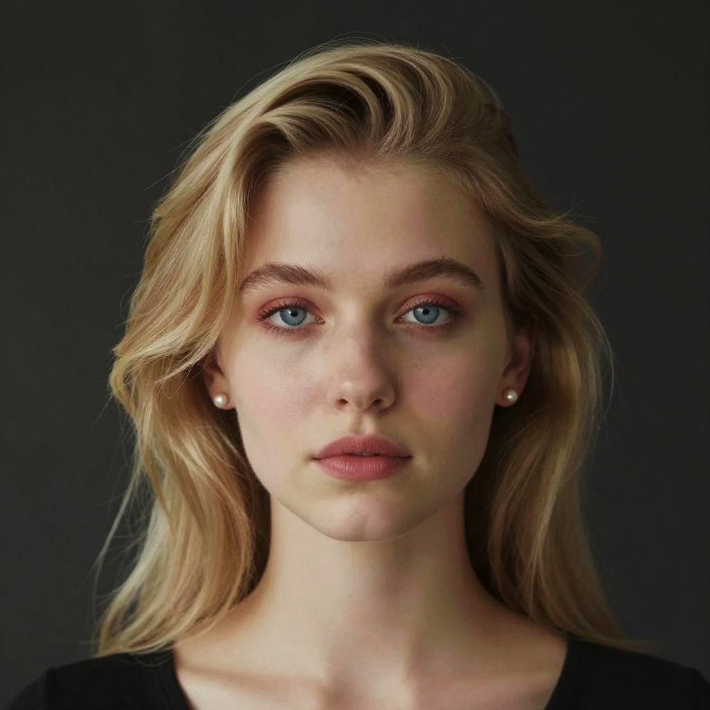 This is a digital, hyper-realistic portrait of a young woman with light skin, blue eyes, and shoulder-length, wavy blonde hair. She has subtle, natural makeup with a hint of pink eyeshadow, and wears small pearl earrings. Her expression is neutral, and she's centered against a dark, blurred background. The lighting highlights her facial features and hair, giving the image a soft, three-dimensional effect.
