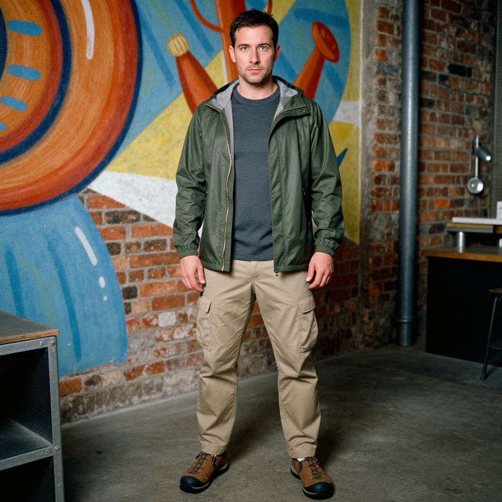 A man, olive green packable rain shell, khaki tapered utility pants, dark gray long-sleeve performance shirt, brown slip-resistant hiking shoes, industrial-chic interior, exposed brick walls, vibrant murals, AgfaColor film, focused expression. Man has masculine face and piercing eyes