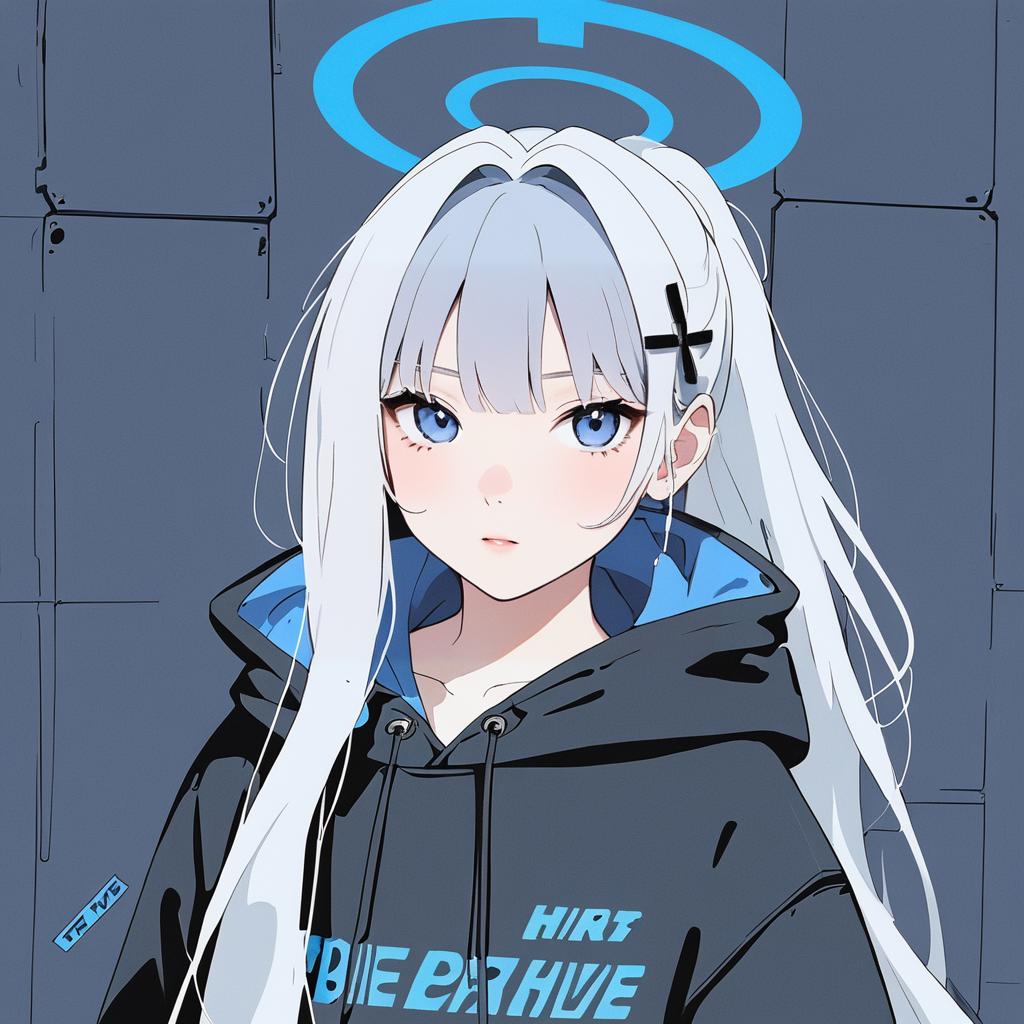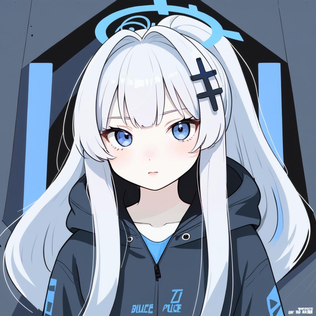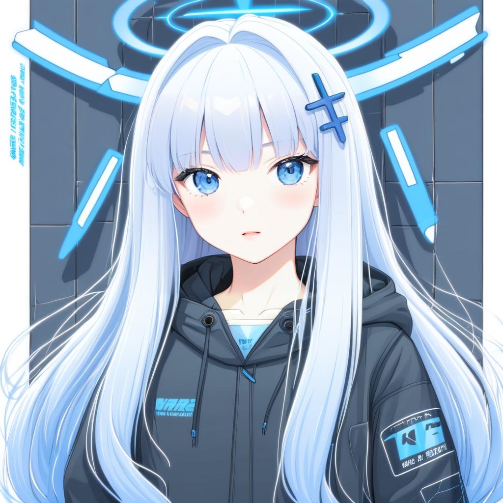 Digital anime-style portrait of a girl with long white hair tied in a ponytail, adorned with a black cross hair ornament. She has striking blue eyes and subtle blush on her cheeks. She is wearing a dark grey zip-up hoodie with blue accents and a blue shirt underneath. The background features abstract dark shapes with light blue highlights. The character design includes a halo-like shape above her head.