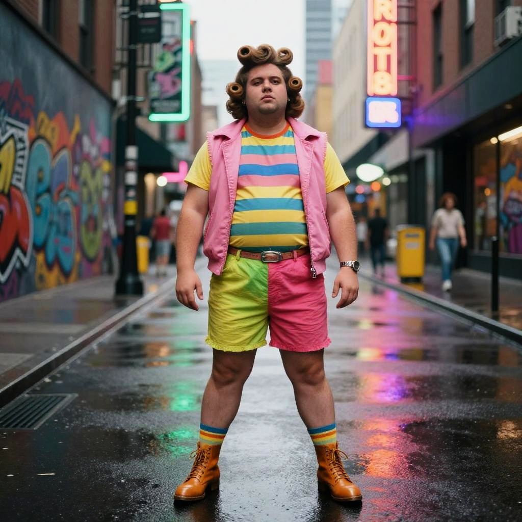 A fat guy with a perm hairstyle standing confidently in a vibrant urban street, colorful graffiti walls in the background, wearing retro 80s clothing, bright neon lights reflecting off wet pavement, cinematic lighting with a lively city atmosphere.