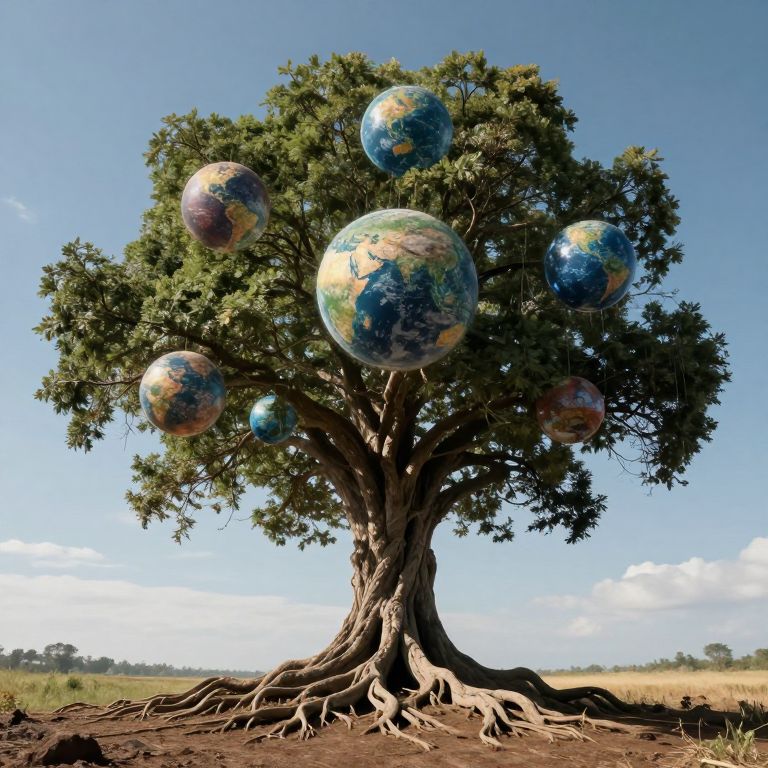 Rooted in the earth yet reaching toward the heavens, this ancient tree cradles a cosmic dance of suspended worlds, evoking a profound sense of wonder and the interconnectedness of existence.