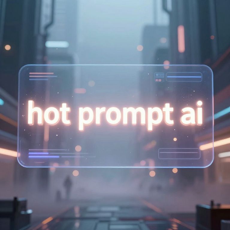 Photograph of a futuristic urban street at dusk, with neon lights and blurred city buildings in the background. Dominating the center is a transparent digital overlay displaying white, glowing text reading "hot prompt ai" with faint blue and red lines around it. The scene is bathed in a bluish hue, with subtle light reflections and mist adding a cyberpunk aesthetic. The overlay text is sharp, contrasting with the soft, hazy cityscape behind it. The overall composition suggests a blend of technology and urban environment.