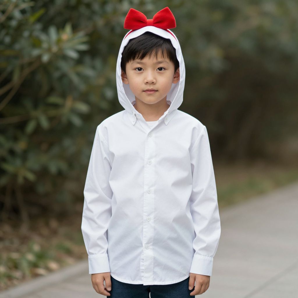 Photograph of an Asian boy standing on a sidewalk, wearing a white long-sleeve shirt and dark blue pants. He has short black hair and is wearing a white hooded costume with a large red bow on top. The background is blurred, featuring green foliage on the left and a concrete path on the right. The boy's expression is neutral, and the overall scene is well-lit with natural light. The boy's costume contrasts sharply with his dark hair and the green background.