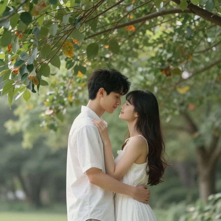 Photograph of a young Asian couple standing under a tree with green leaves and orange berries. The man, with short black hair and wearing a white short-sleeve shirt, gazes at the woman. She has long, wavy black hair, wears a white sleeveless dress, and looks back at him with a gentle smile. They are standing close, with her hand on his chest and his hand on her waist. The background is a blurred, lush green park with sunlight filtering through the leaves. The scene is romantic and serene.