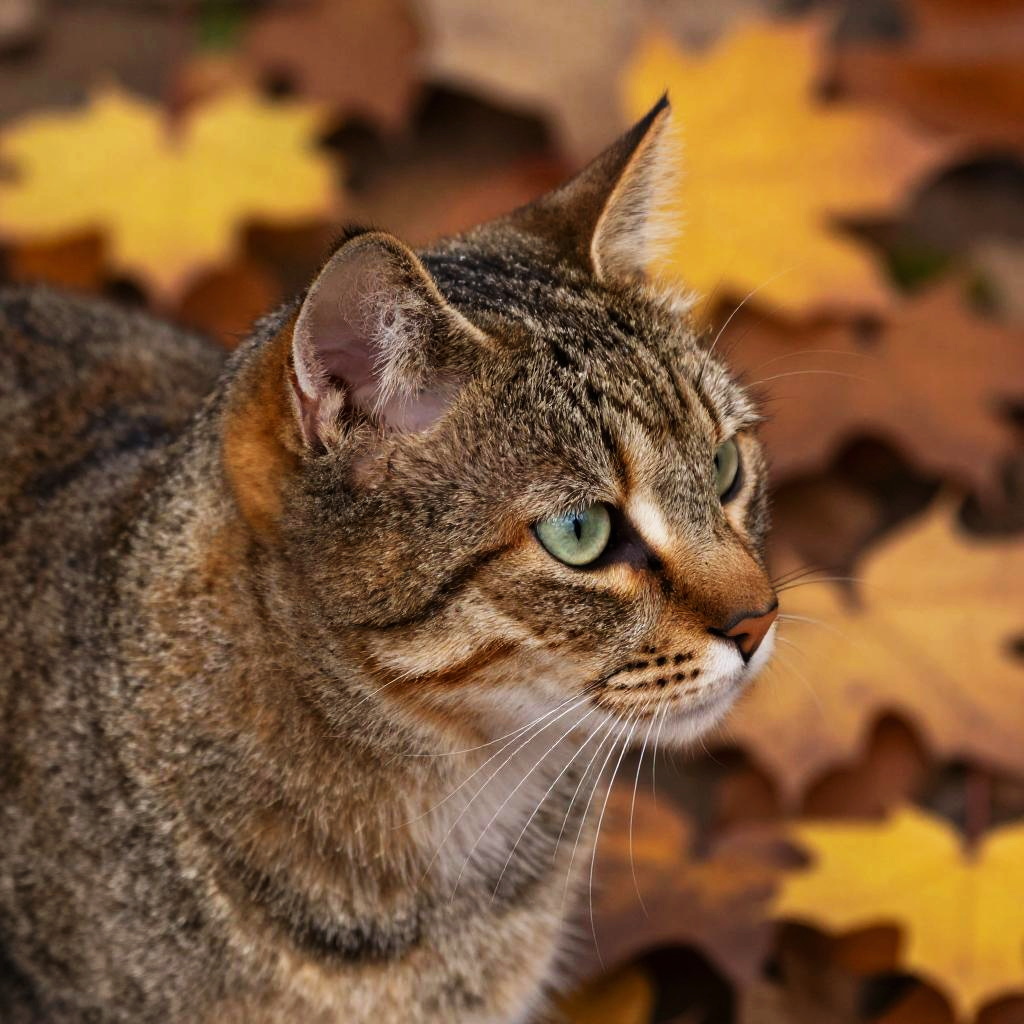 Cat facing sideways with a backdrop of autumn leaves, rich warm color palette, crystal clear fur texture, gentle expression, soft lighting highlighting contours, fine art photographic realism