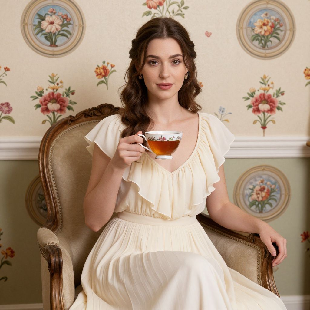 Woman seated gracefully in a vintage armchair, holding a delicate porcelain teacup filled with amber liquid, her attire featuring a cream gown with ruffled neckline against a floral wallpaper backdrop adorned with circular medallions and vibrant blossoms.