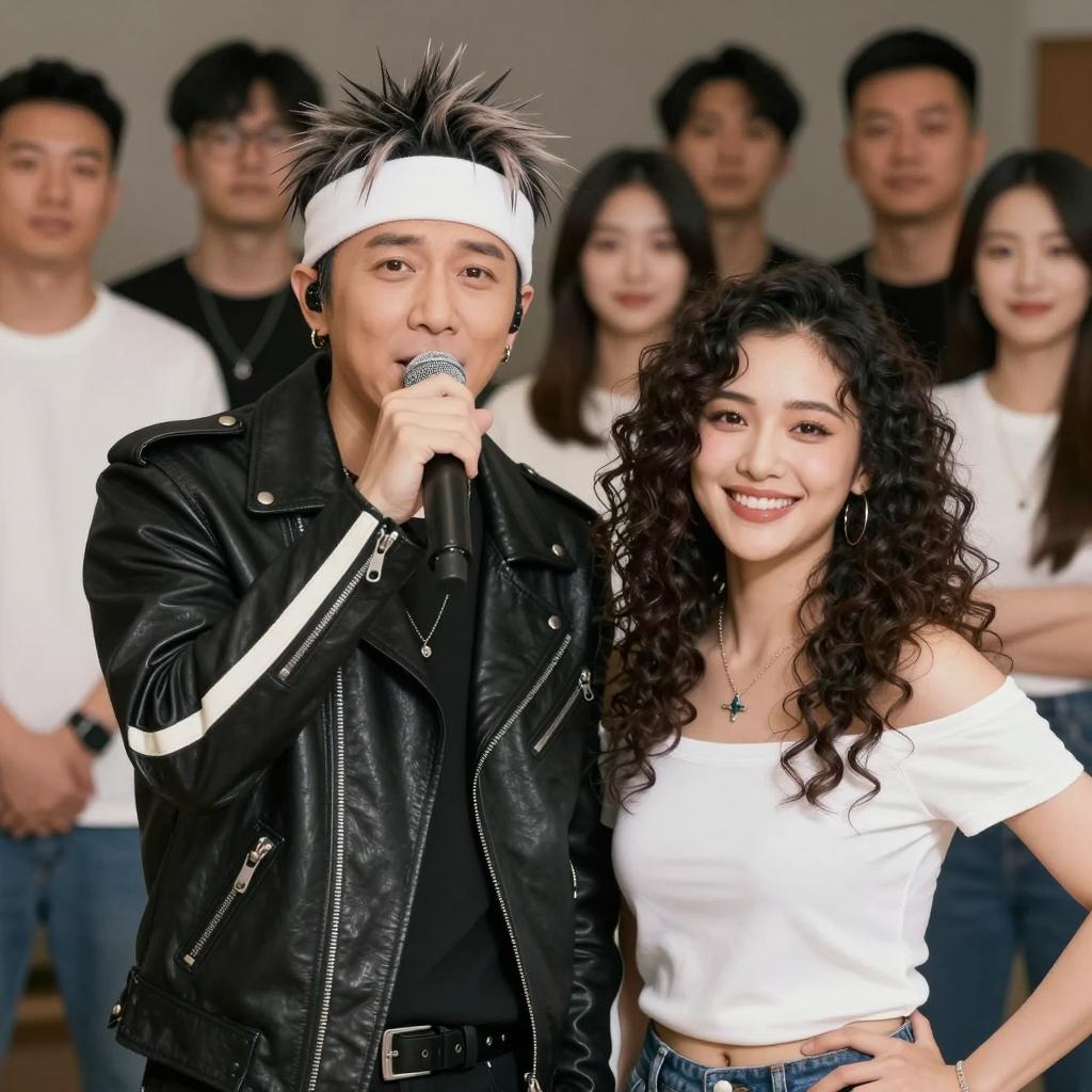 A male singer with spiked hair, white headband, and black leather jacket with white stripes, holding a microphone. He sings to a smiling woman with curly dark hair, wearing a white off-shoulder top and necklace. Background: blurred audience of 7 people, casual clothing. Singer's left arm raised, microphone close to mouth. Woman's right hand rests on her hip.