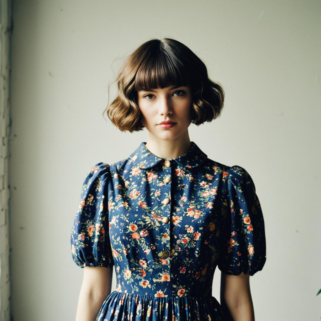 Wavy Bowl Cut hairstyle on man, wearing vintage blouse with high-waisted skirt, in rooftop, captured in fashion editorial style with soft overcast light.