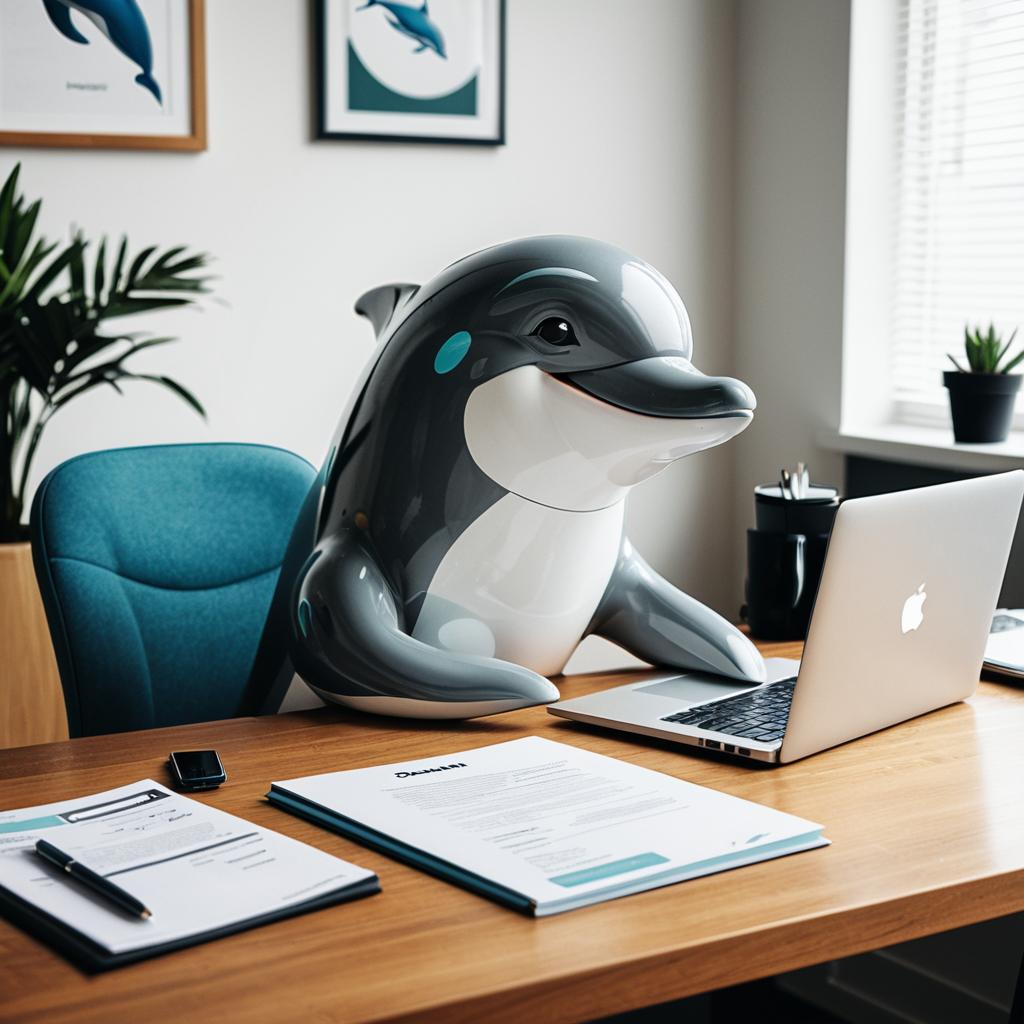 A cute and clever cartoon dolphin with confident and intelligent expression sitting at a wooden desk. The dolphin has gender-neutral features and is positioned next to an open laptop and visible resumes, set against a plain light background, creating a lighthearted and professional atmosphere.