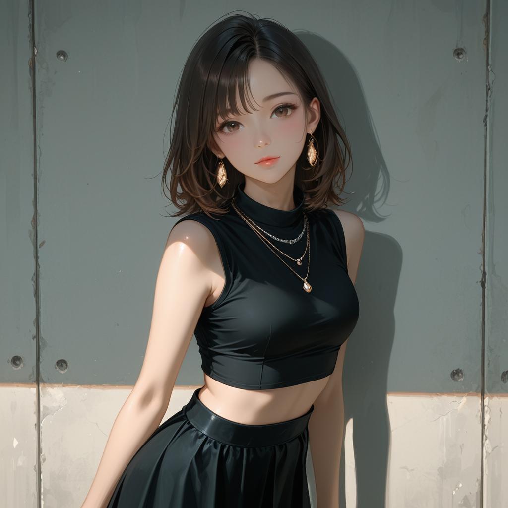 Photorealistic image of a young woman with long brown hair and brown eyes, standing against a simple grey background. She wears a green long-sleeve crop top paired with a shiny black skirt. The woman accessorizes with a black leather choker featuring a green pendant, a delicate gold necklace, and matching dangling earrings. Her expression is soft and neutral, looking directly at the viewer.