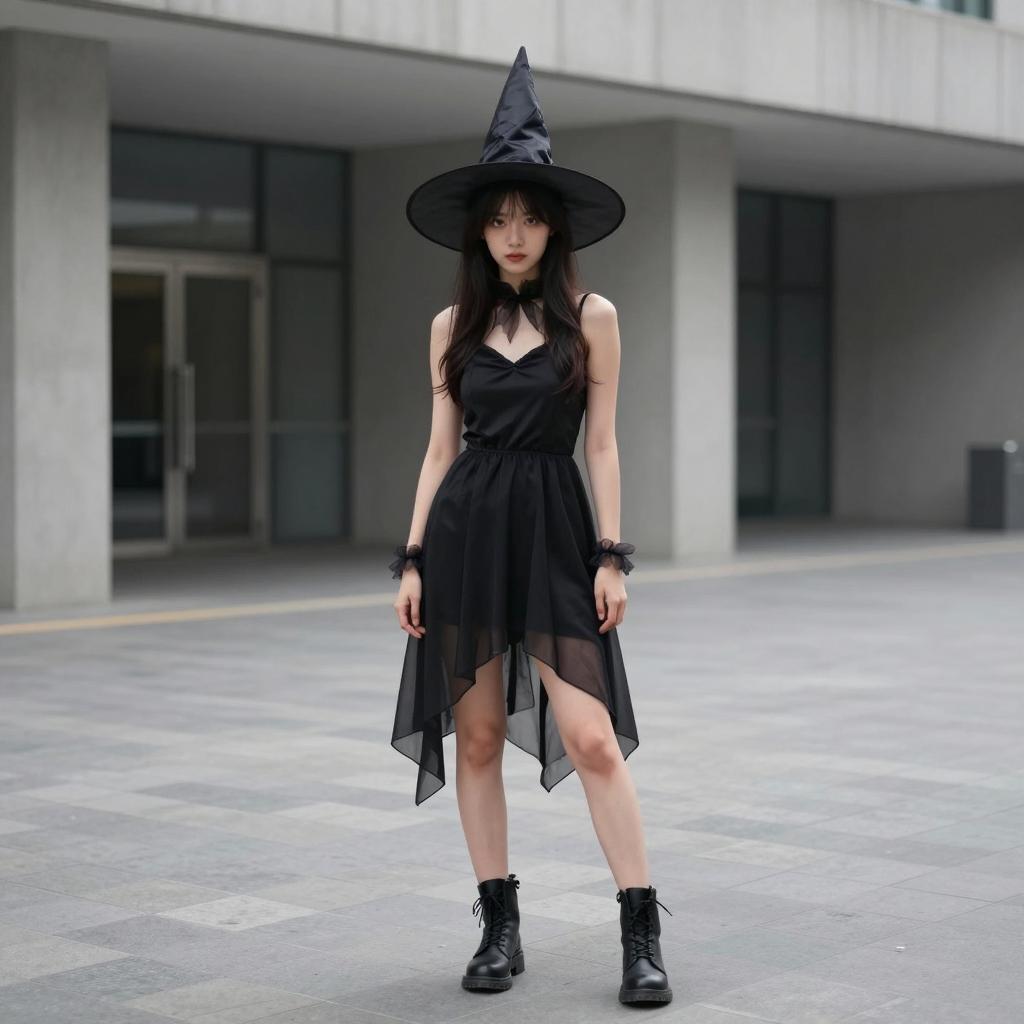 Morticia costume girl, photorealistic, gothic girl, standing, outdoor, daytime, black dress, long sleeves, belt, black tights, black boots, large black hat with veil, long black hair, pale skin, red lipstick, background: blurred people, yellow shirt, white wall, potted plant, paved ground, street, bright sunlight, fashion, goth style, soft shadows, natural light, standing pose, detailed clothing, realistic ures, slight blur in background, "MOTALOM" in bottom right corner