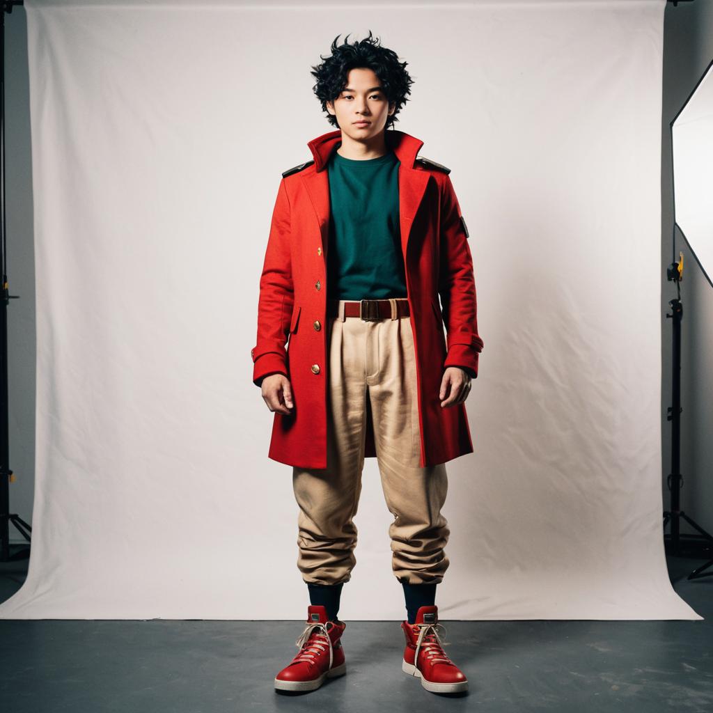 Hero Academia Character Hero Costume, man in a red coat and tan pants standing in a studio