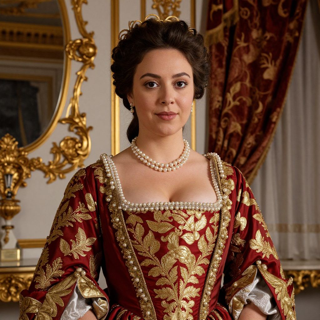 Photograph of a Middle Eastern woman with a medium build and fair skin, wearing an ornate, deep red Renaissance-style dress with gold leaf patterns and silver lace trim. She has dark, wavy hair styled in an elegant updo, and wears a pearl necklace and matching earrings. Her expression is calm and confident. The background features an opulent room with gold-framed mirrors, intricate gold detailing, and rich, patterned red curtains. The room's luxurious decor suggests a historical or royal setting. The lighting is soft, highlighting the textures and colors of her dress and the room's opulent elements.