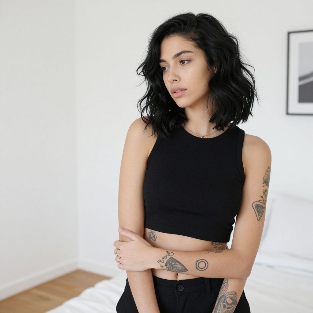 Photograph of a young woman with medium-length black wavy hair, light skin, and multiple tattoos on her arms and torso. She's wearing a black sleeveless crop top and black pants, standing in a bright, white-walled room with wooden flooring. Her arms are crossed over her stomach, and she's looking to the side with a soft expression. Behind her, there's a bed with white bedding and a framed picture on the wall.